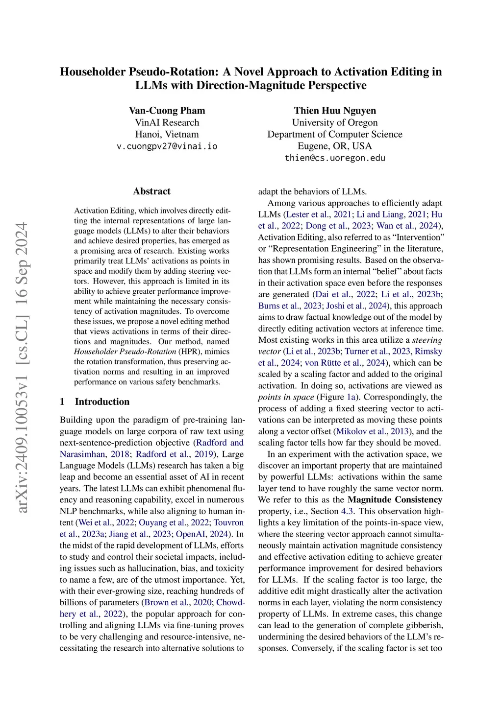 Activation Editing, which involves directly editting the internal representations of large language models (LLMs) to alter their behaviors and achieve desired properties, has emerged as a promising area of research. Existing works primarily treat LLMs' activations as points in space and modify them by adding steering vectors. However, this approach is limited in its ability to achieve greater performance improvement while maintaining the necessary consistency of activation magnitudes. To overcome these issues, we propose a novel editing method that views activations in terms of their directions and magnitudes. Our method, named Householder Pseudo-Rotation (HPR), mimics the rotation transformation, thus preserving activation norms and resulting in an improved performance on various safety benchmarks.