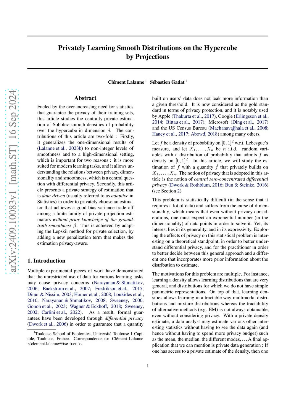 Fueled by the ever-increasing need for statistics that guarantee the privacy of their training sets, this article studies the centrally-private estimation of Sobolev-smooth densities of probability over the hypercube in dimension d. The contributions of this article are two-fold : Firstly, it generalizes the one dimensional results of (Lalanne et al., 2023) to non-integer levels of smoothness and to a high-dimensional setting, which is important for two reasons : it is more suited for modern learning tasks, and it allows understanding the relations between privacy, dimensionality and smoothness, which is a central question with differential privacy. Secondly, this article presents a private strategy of estimation that is data-driven (usually referred to as adaptive in Statistics) in order to privately choose an estimator that achieves a good bias-variance trade-off among a finite family of private projection estimators without prior knowledge of the ground-truth smoothness . This is achieved by adapting the Lepskii method for private selection, by adding a new penalization term that makes the estimation privacy-aware.