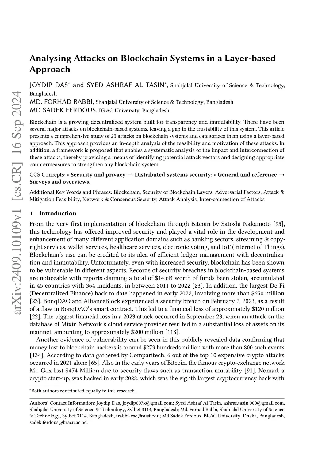 Blockchain is a growing decentralized system built for transparency and immutability. There have been several major attacks on blockchain-based systems, leaving a gap in the trustability of this system. This article presents a comprehensive study of 23 attacks on blockchain systems and categorizes them using a layer-based approach. This approach provides an in-depth analysis of the feasibility and motivation of these attacks. In addition, a framework is proposed that enables a systematic analysis of the impact and interconnection of these attacks, thereby providing a means of identifying potential attack vectors and designing appropriate countermeasures to strengthen any blockchain system.