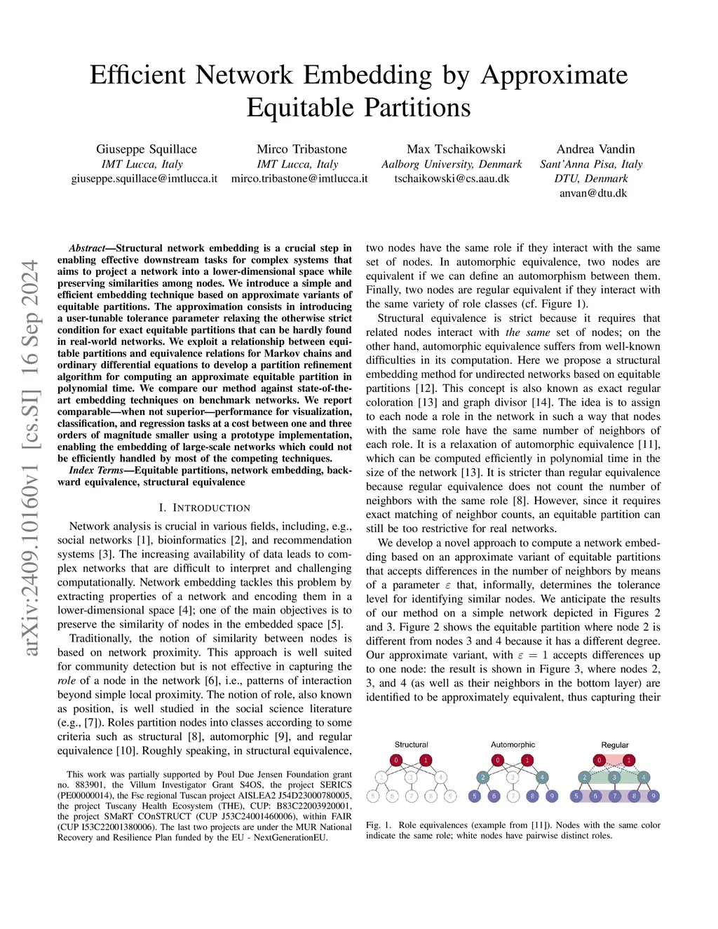 Structural network embedding is a crucial step in enabling effective downstream tasks for complex systems that aims to project a network into a lower-dimensional space while preserving similarities among nodes. We introduce a simple and efficient embedding technique based on approximate variants of equitable partitions. The approximation consists in introducing a user-tunable tolerance parameter relaxing the otherwise strict condition for exact equitable partitions that can be hardly found in real-world networks. We exploit a relationship between equitable partitions and equivalence relations for Markov chains and ordinary differential equations to develop a partition refinement algorithm for computing an approximate equitable partition in polynomial time. We compare our method against state-of-the-art embedding techniques on benchmark networks. We report comparable -- when not superior -- performance for visualization, classification, and regression tasks at a cost between one and three orders of magnitude smaller using a prototype implementation, enabling the embedding of large-scale networks which could not be efficiently handled by most of the competing techniques.