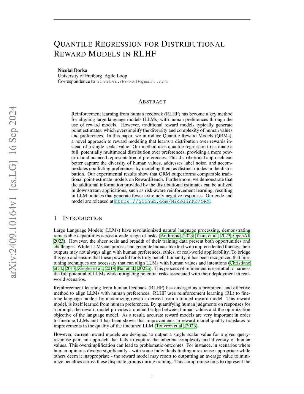 Quantile Regression for Distributional Reward Models in RLHF