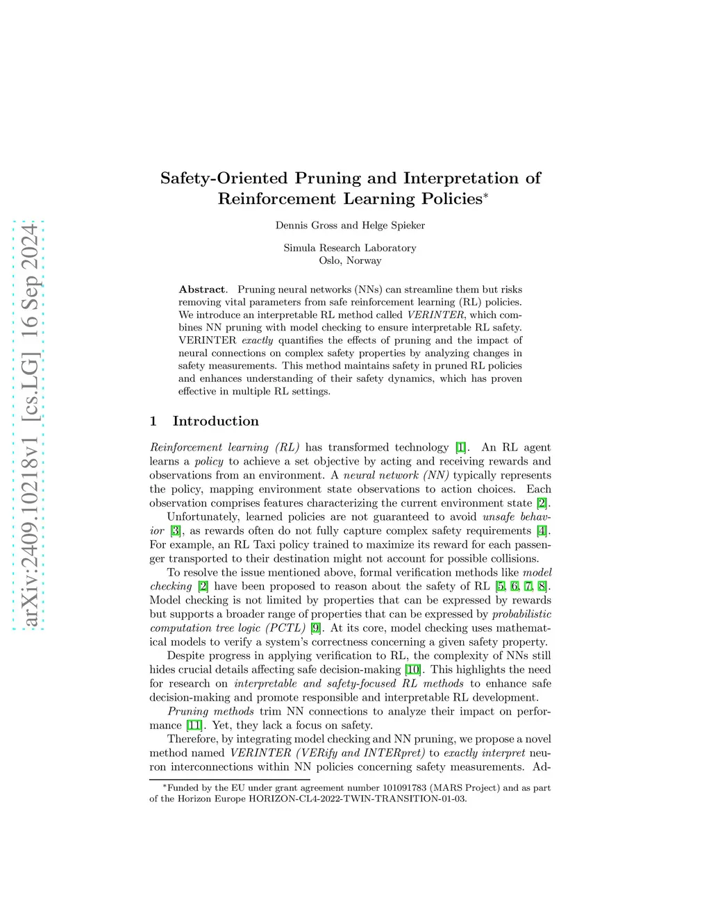 Pruning neural networks (NNs) can streamline them but risks removing vital parameters from safe reinforcement learning (RL) policies. We introduce an interpretable RL method called VERINTER, which combines NN pruning with model checking to ensure interpretable RL safety. VERINTER exactly quantifies the effects of pruning and the impact of neural connections on complex safety properties by analyzing changes in safety measurements. This method maintains safety in pruned RL policies and enhances understanding of their safety dynamics, which has proven effective in multiple RL settings.