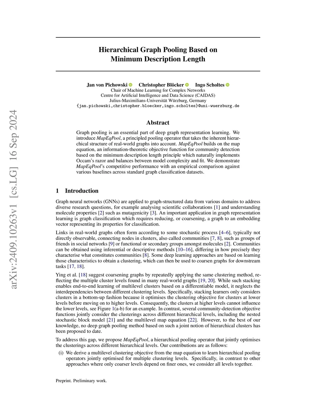 Graph pooling compresses graphs and summarises their topological properties and features in a vectorial representation. It is an essential part of deep graph representation learning and is indispensable in graph-level tasks like classification or regression. Current approaches pool hierarchical structures in graphs by iteratively applying shallow pooling operators up to a fixed depth. However, they disregard the interdependencies between structures at different hierarchical levels and do not adapt to datasets that contain graphs with different sizes that may require pooling with various depths. To address these issues, we propose MDL-Pool, a pooling operator based on the minimum description length (MDL) principle, whose loss formulation explicitly models the interdependencies between different hierarchical levels and facilitates a direct comparison between multiple pooling alternatives with different depths. MDP-Pool builds on the map equation, an information-theoretic objective function for community detection, which naturally implements Occam's razor and balances between model complexity and goodness-of-fit via the MDL. We demonstrate MDL-Pool's competitive performance in an empirical evaluation against various baselines across standard graph classification datasets.