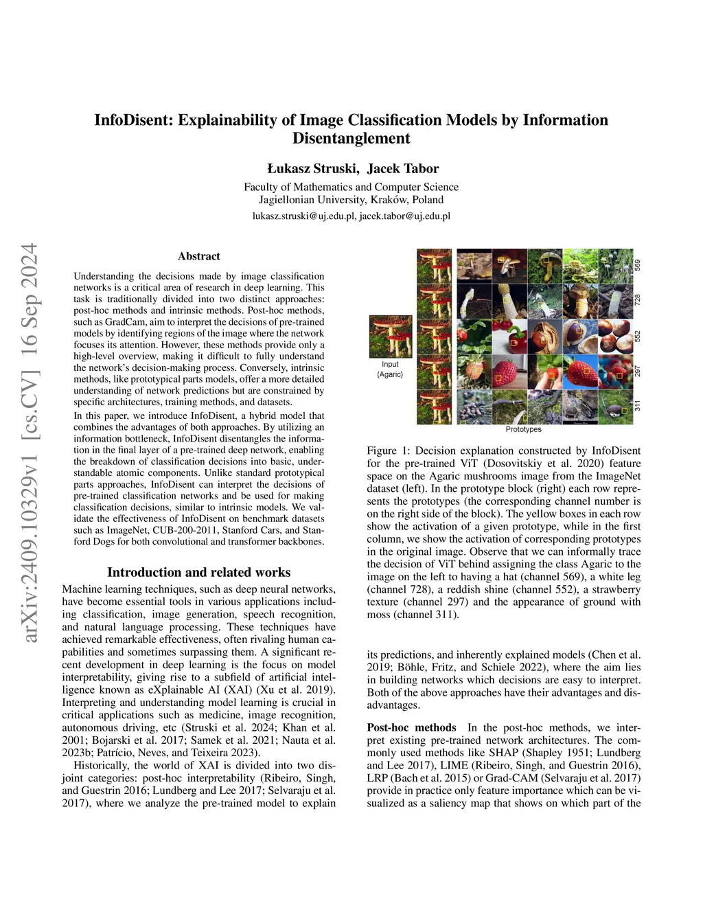 In this work, we introduce InfoDisent, a hybrid approach to explainability based on the information bottleneck principle. InfoDisent enables the disentanglement of information in the final layer of any pretrained model into atomic concepts, which can be interpreted as prototypical parts. This approach merges the flexibility of post-hoc methods with the concept-level modeling capabilities of self-explainable neural networks, such as ProtoPNets. We demonstrate the effectiveness of InfoDisent through computational experiments and user studies across various datasets using modern backbones such as ViTs and convolutional networks. Notably, InfoDisent generalizes the prototypical parts approach to novel domains (ImageNet).