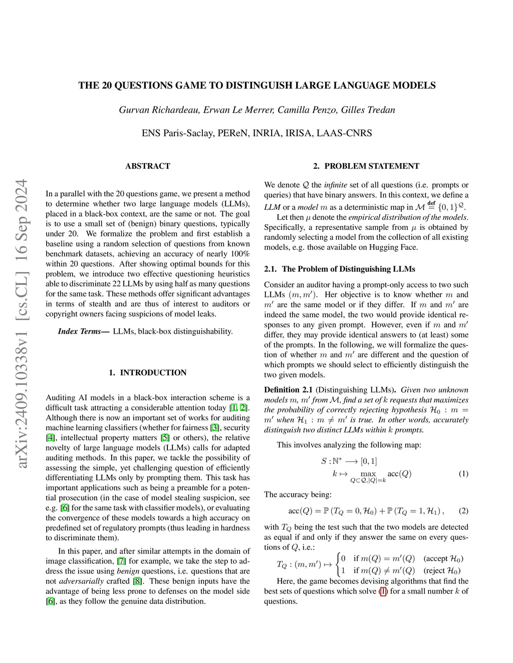 In a parallel with the 20 questions game, we present a method to determine whether two large language models (LLMs), placed in a black-box context, are the same or not. The goal is to use a small set of (benign) binary questions, typically under 20. We formalize the problem and first establish a baseline using a random selection of questions from known benchmark datasets, achieving an accuracy of nearly 100% within 20 questions. After showing optimal bounds for this problem, we introduce two effective questioning heuristics able to discriminate 22 LLMs by using half as many questions for the same task. These methods offer significant advantages in terms of stealth and are thus of interest to auditors or copyright owners facing suspicions of model leaks.
