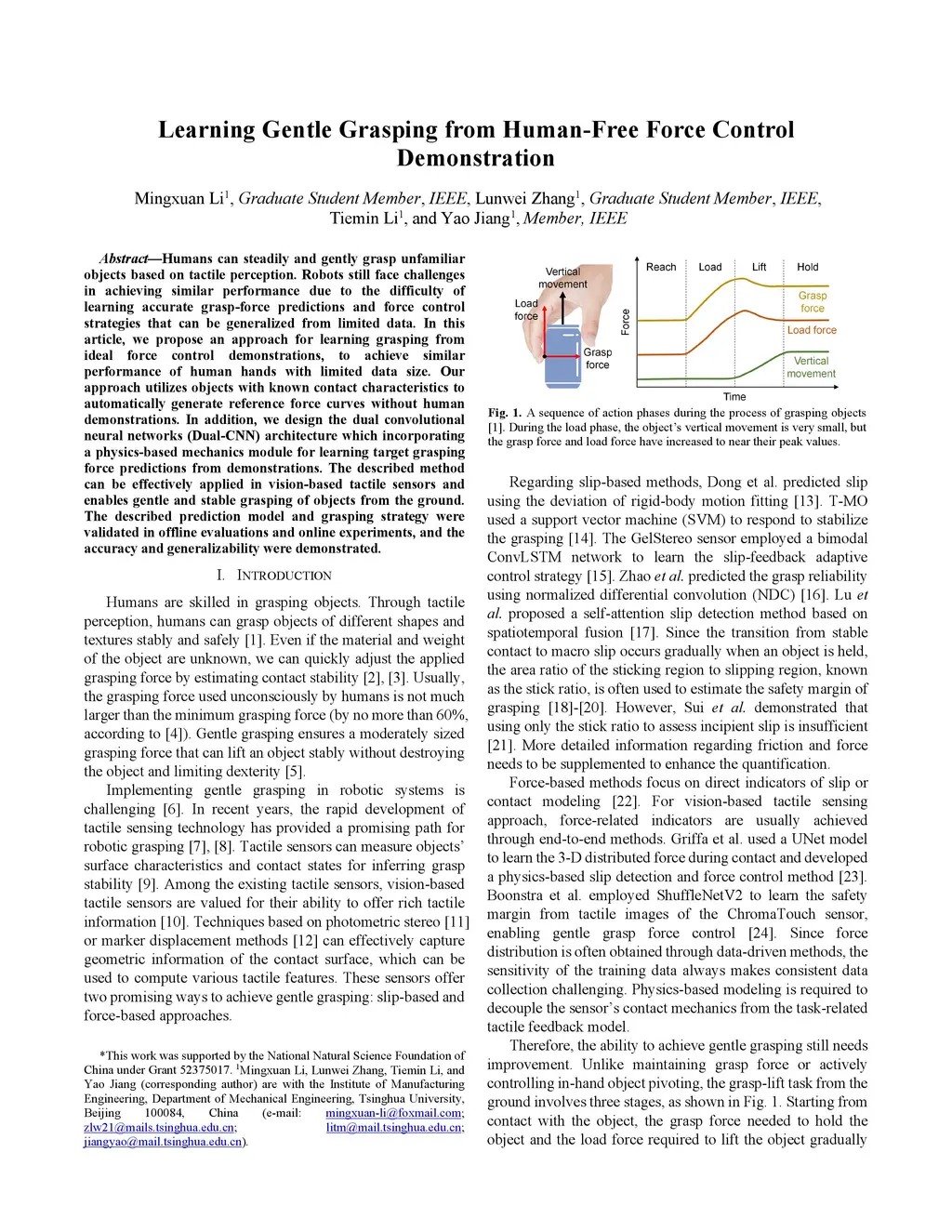 Humans can steadily and gently grasp unfamiliar objects based on tactile perception. Robots still face challenges in achieving similar performance due to the difficulty of learning accurate grasp-force predictions and force control strategies that can be generalized from limited data. In this article, we propose an approach for learning grasping from ideal force control demonstrations, to achieve similar performance of human hands with limited data size. Our approach utilizes objects with known contact characteristics to automatically generate reference force curves without human demonstrations. In addition, we design the dual convolutional neural networks (Dual-CNN) architecture which incorporating a physics-based mechanics module for learning target grasping force predictions from demonstrations. The described method can be effectively applied in vision-based tactile sensors and enables gentle and stable grasping of objects from the ground. The described prediction model and grasping strategy were validated in offline evaluations and online experiments, and the accuracy and generalizability were demonstrated.