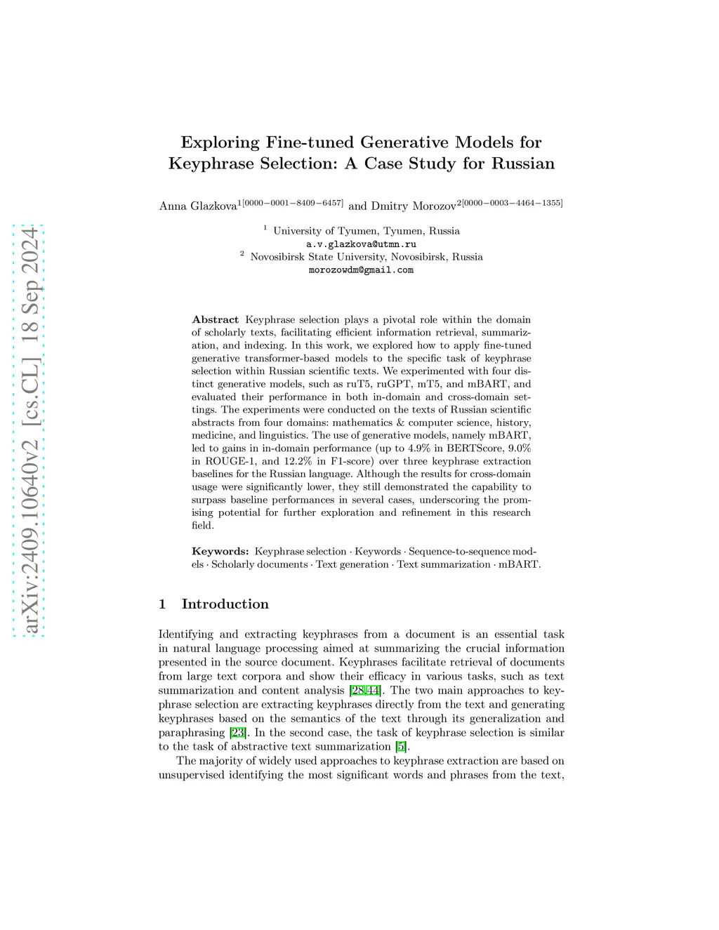Keyphrase selection plays a pivotal role within the domain of scholarly texts, facilitating efficient information retrieval, summarization, and indexing. In this work, we explored how to apply fine-tuned generative transformer-based models to the specific task of keyphrase selection within Russian scientific texts. We experimented with four distinct generative models, such as ruT5, ruGPT, mT5, and mBART, and evaluated their performance in both in-domain and cross-domain settings. The experiments were conducted on the texts of Russian scientific abstracts from four domains: mathematics & computer science, history, medicine, and linguistics. The use of generative models, namely mBART, led to gains in in-domain performance (up to 4.9% in BERTScore, 9.0% in ROUGE-1, and 12.2% in F1-score) over three keyphrase extraction baselines for the Russian language. Although the results for cross-domain usage were significantly lower, they still demonstrated the capability to surpass baseline performances in several cases, underscoring the promising potential for further exploration and refinement in this research field.