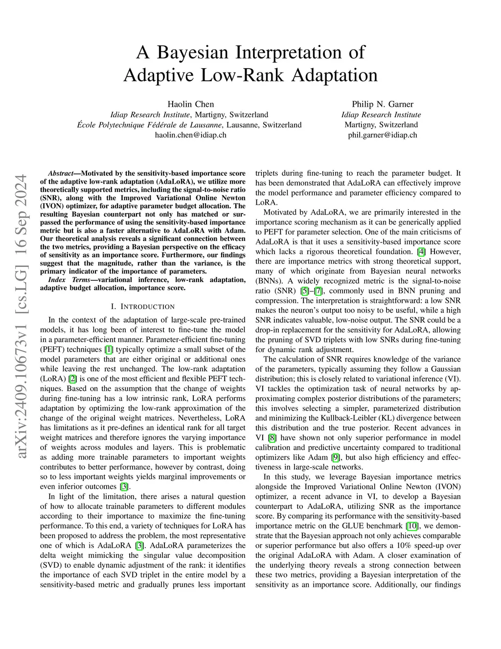 Motivated by the sensitivity-based importance score of the adaptive low-rank adaptation (AdaLoRA), we utilize more theoretically supported metrics, including the signal-to-noise ratio (SNR), along with the Improved Variational Online Newton (IVON) optimizer, for adaptive parameter budget allocation. The resulting Bayesian counterpart not only has matched or surpassed the performance of using the sensitivity-based importance metric but is also a faster alternative to AdaLoRA with Adam. Our theoretical analysis reveals a significant connection between the two metrics, providing a Bayesian perspective on the efficacy of sensitivity as an importance score. Furthermore, our findings suggest that the magnitude, rather than the variance, is the primary indicator of the importance of parameters.