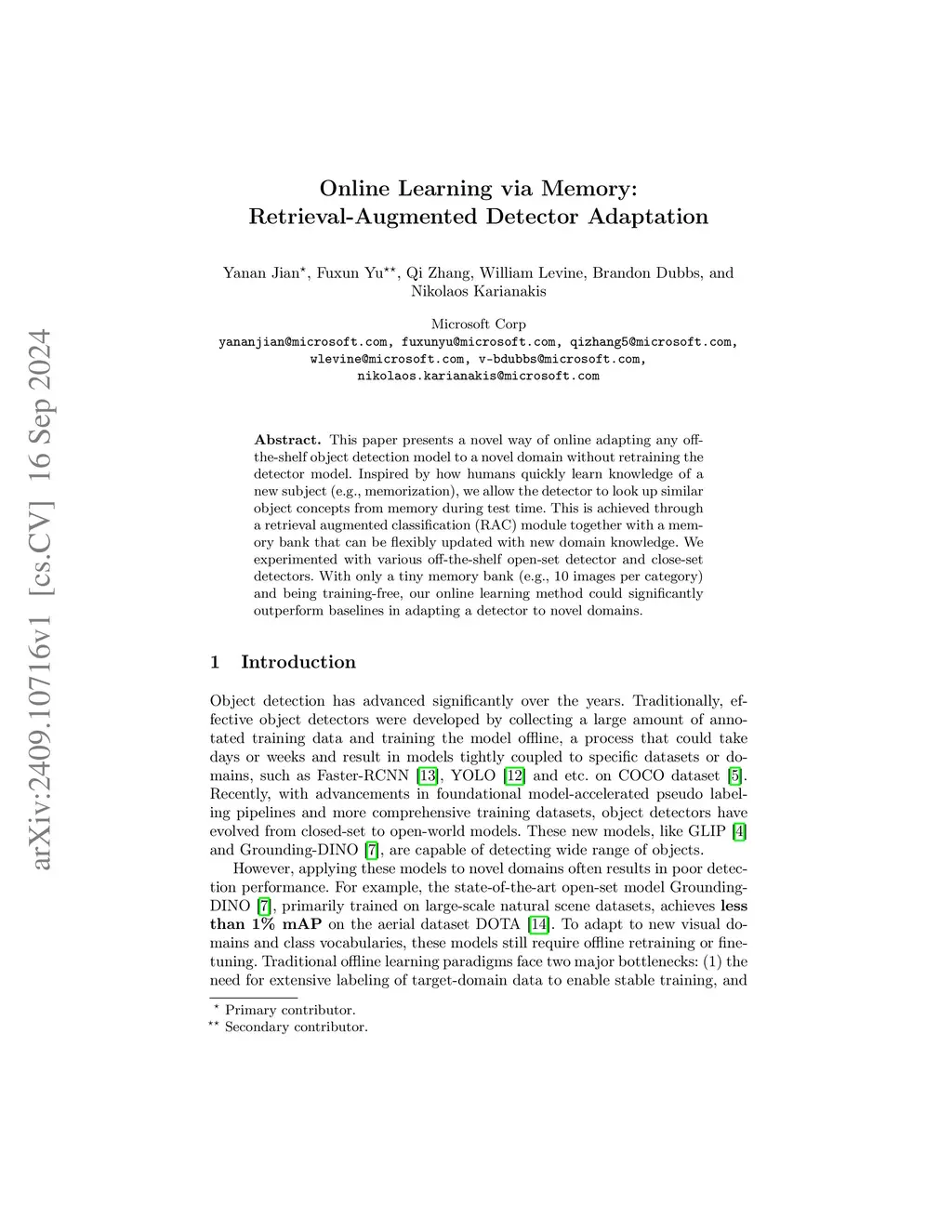 This paper presents a novel way of online adapting any off-the-shelf object detection model to a novel domain without retraining the detector model. Inspired by how humans quickly learn knowledge of a new subject (e.g., memorization), we allow the detector to look up similar object concepts from memory during test time. This is achieved through a retrieval augmented classification (RAC) module together with a memory bank that can be flexibly updated with new domain knowledge. We experimented with various off-the-shelf open-set detector and close-set detectors. With only a tiny memory bank (e.g., 10 images per category) and being training-free, our online learning method could significantly outperform baselines in adapting a detector to novel domains.