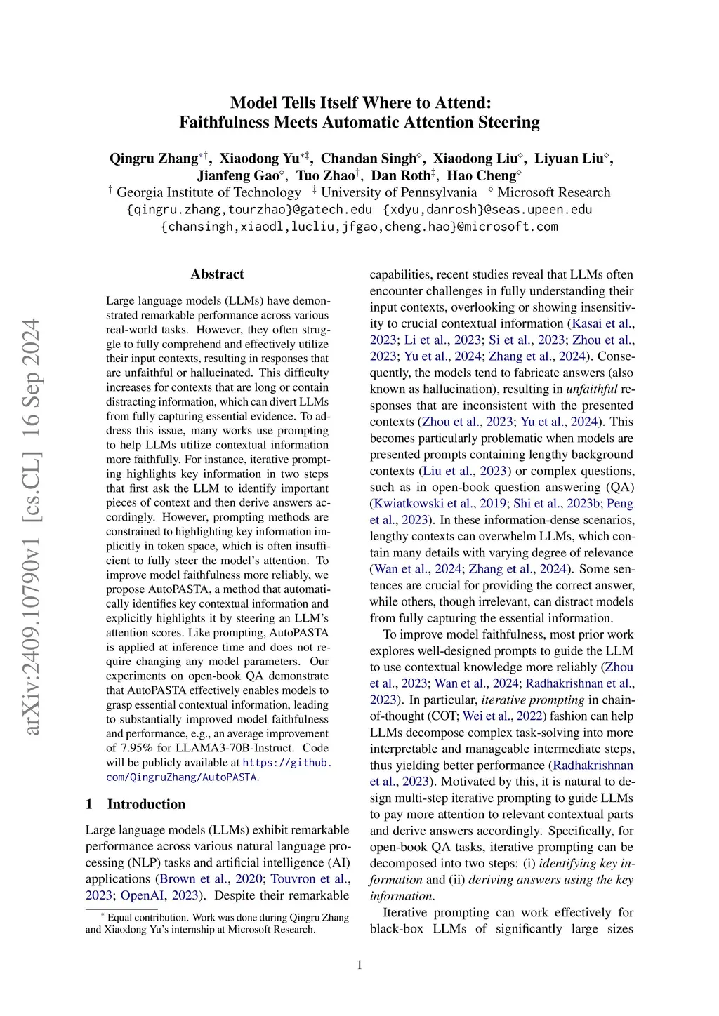 Large language models (LLMs) have demonstrated remarkable performance across various real-world tasks. However, they often struggle to fully comprehend and effectively utilize their input contexts, resulting in responses that are unfaithful or hallucinated. This difficulty increases for contexts that are long or contain distracting information, which can divert LLMs from fully capturing essential evidence. To address this issue, many works use prompting to help LLMs utilize contextual information more faithfully. For instance, iterative prompting highlights key information in two steps that first ask the LLM to identify important pieces of context and then derive answers accordingly. However, prompting methods are constrained to highlighting key information implicitly in token space, which is often insufficient to fully steer the model's attention. To improve model faithfulness more reliably, we propose AutoPASTA, a method that automatically identifies key contextual information and explicitly highlights it by steering an LLM's attention scores. Like prompting, AutoPASTA is applied at inference time and does not require changing any model parameters. Our experiments on open-book QA demonstrate that AutoPASTA effectively enables models to grasp essential contextual information, leading to substantially improved model faithfulness and performance, e.g., an average improvement of 7.95% for LLAMA3-70B-Instruct. Code will be publicly available at https://github.com/QingruZhang/AutoPASTA .