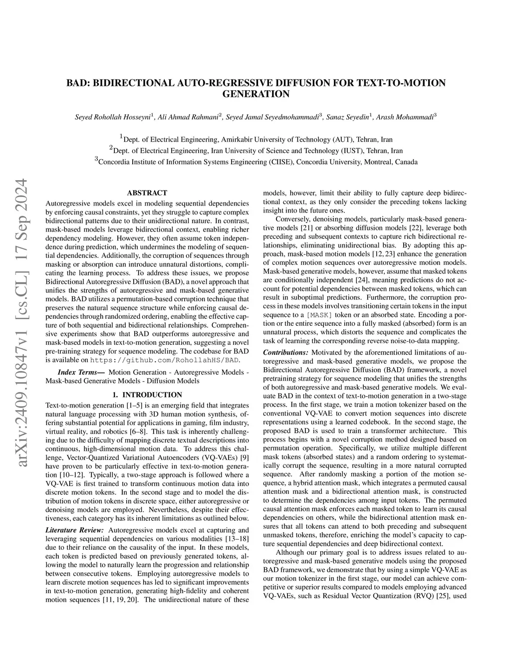 Autoregressive models excel in modeling sequential dependencies by enforcing causal constraints, yet they struggle to capture complex bidirectional patterns due to their unidirectional nature. In contrast, mask-based models leverage bidirectional context, enabling richer dependency modeling. However, they often assume token independence during prediction, which undermines the modeling of sequential dependencies. Additionally, the corruption of sequences through masking or absorption can introduce unnatural distortions, complicating the learning process. To address these issues, we propose Bidirectional Autoregressive Diffusion (BAD), a novel approach that unifies the strengths of autoregressive and mask-based generative models. BAD utilizes a permutation-based corruption technique that preserves the natural sequence structure while enforcing causal dependencies through randomized ordering, enabling the effective capture of both sequential and bidirectional relationships. Comprehensive experiments show that BAD outperforms autoregressive and mask-based models in text-to-motion generation, suggesting a novel pre-training strategy for sequence modeling. The codebase for BAD is available on https://github.com/RohollahHS/BAD.