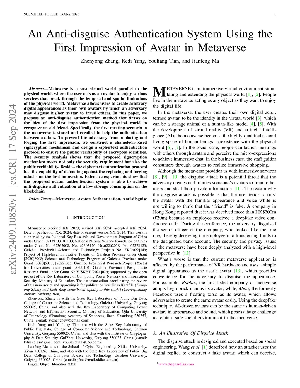 Metaverse is a vast virtual world parallel to the physical world, where the user acts as an avatar to enjoy various services that break through the temporal and spatial limitations of the physical world. Metaverse allows users to create arbitrary digital appearances as their own avatars by which an adversary may disguise his/her avatar to fraud others. In this paper, we propose an anti-disguise authentication method that draws on the idea of the first impression from the physical world to recognize an old friend. Specifically, the first meeting scenario in the metaverse is stored and recalled to help the authentication between avatars. To prevent the adversary from replacing and forging the first impression, we construct a chameleon-based signcryption mechanism and design a ciphertext authentication protocol to ensure the public verifiability of encrypted identities. The security analysis shows that the proposed signcryption mechanism meets not only the security requirement but also the public verifiability. Besides, the ciphertext authentication protocol has the capability of defending against the replacing and forging attacks on the first impression. Extensive experiments show that the proposed avatar authentication system is able to achieve anti-disguise authentication at a low storage consumption on the blockchain.