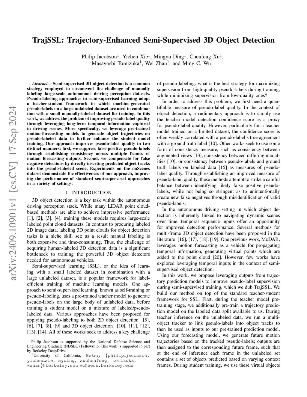 TrajSSL: Trajectory-Enhanced Semi-Supervised 3D Object Detection