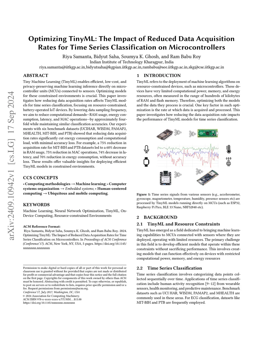 Tiny Machine Learning (TinyML) enables efficient, lowcost, and privacy preserving machine learning inference directly on microcontroller units (MCUs) connected to sensors. Optimizing models for these constrained environments is crucial. This paper investigates how reducing data acquisition rates affects TinyML models for time series classification, focusing on resource-constrained, battery operated IoT devices. By lowering data sampling frequency, we aim to reduce computational demands RAM usage, energy consumption, latency, and MAC operations by approximately fourfold while maintaining similar classification accuracies. Our experiments with six benchmark datasets (UCIHAR, WISDM, PAMAP2, MHEALTH, MITBIH, and PTB) showed that reducing data acquisition rates significantly cut energy consumption and computational load, with minimal accuracy loss. For example, a 75\% reduction in acquisition rate for MITBIH and PTB datasets led to a 60\% decrease in RAM usage, 75\% reduction in MAC operations, 74\% decrease in latency, and 70\% reduction in energy consumption, without accuracy loss. These results offer valuable insights for deploying efficient TinyML models in constrained environments.
