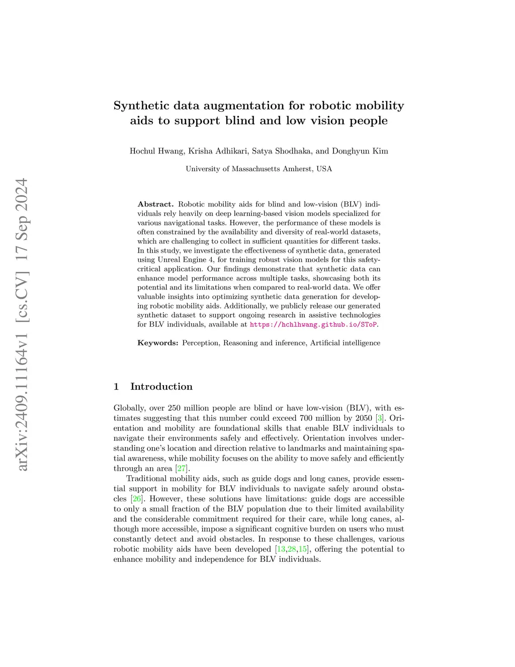 Robotic mobility aids for blind and low-vision (BLV) individuals rely heavily on deep learning-based vision models specialized for various navigational tasks. However, the performance of these models is often constrained by the availability and diversity of real-world datasets, which are challenging to collect in sufficient quantities for different tasks. In this study, we investigate the effectiveness of synthetic data, generated using Unreal Engine 4, for training robust vision models for this safety-critical application. Our findings demonstrate that synthetic data can enhance model performance across multiple tasks, showcasing both its potential and its limitations when compared to real-world data. We offer valuable insights into optimizing synthetic data generation for developing robotic mobility aids. Additionally, we publicly release our generated synthetic dataset to support ongoing research in assistive technologies for BLV individuals, available at https://hchlhwang.github.io/SToP.