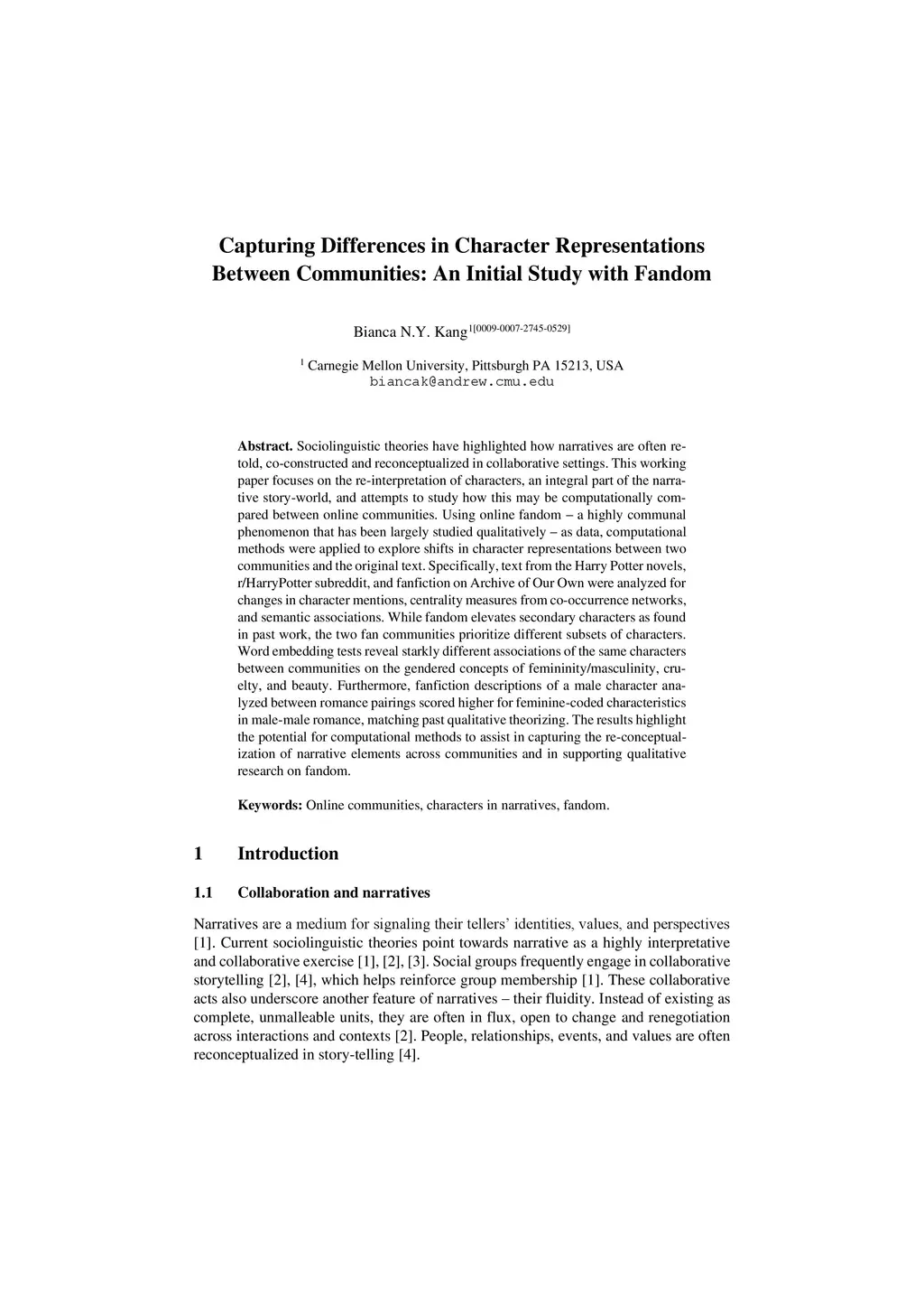 Sociolinguistic theories have highlighted how narratives are often retold, co-constructed and reconceptualized in collaborative settings. This working paper focuses on the re-interpretation of characters, an integral part of the narrative story-world, and attempts to study how this may be computationally compared between online communities. Using online fandom - a highly communal phenomenon that has been largely studied qualitatively - as data, computational methods were applied to explore shifts in character representations between two communities and the original text. Specifically, text from the Harry Potter novels, r/HarryPotter subreddit, and fanfiction on Archive of Our Own were analyzed for changes in character mentions, centrality measures from co-occurrence networks, and semantic associations. While fandom elevates secondary characters as found in past work, the two fan communities prioritize different subsets of characters. Word embedding tests reveal starkly different associations of the same characters between communities on the gendered concepts of femininity/masculinity, cruelty, and beauty. Furthermore, fanfiction descriptions of a male character analyzed between romance pairings scored higher for feminine-coded characteristics in male-male romance, matching past qualitative theorizing. The results high-light the potential for computational methods to assist in capturing the re-conceptualization of narrative elements across communities and in supporting qualitative research on fandom.