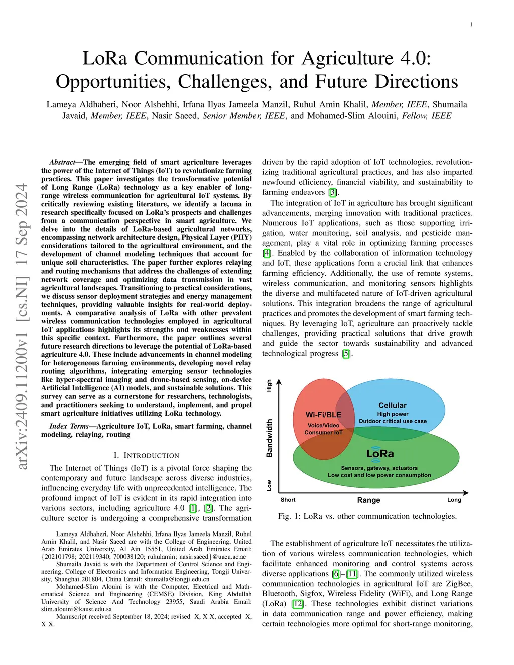The emerging field of smart agriculture leverages the Internet of Things (IoT) to revolutionize farming practices. This paper investigates the transformative potential of Long Range (LoRa) technology as a key enabler of long-range wireless communication for agricultural IoT systems. By reviewing existing literature, we identify a gap in research specifically focused on LoRa's prospects and challenges from a communication perspective in smart agriculture. We delve into the details of LoRa-based agricultural networks, covering network architecture design, Physical Layer (PHY) considerations tailored to the agricultural environment, and channel modeling techniques that account for soil characteristics. The paper further explores relaying and routing mechanisms that address the challenges of extending network coverage and optimizing data transmission in vast agricultural landscapes. Transitioning to practical aspects, we discuss sensor deployment strategies and energy management techniques, offering insights for real-world deployments. A comparative analysis of LoRa with other wireless communication technologies employed in agricultural IoT applications highlights its strengths and weaknesses in this context. Furthermore, the paper outlines several future research directions to leverage the potential of LoRa-based agriculture 4.0. These include advancements in channel modeling for diverse farming environments, novel relay routing algorithms, integrating emerging sensor technologies like hyper-spectral imaging and drone-based sensing, on-device Artificial Intelligence (AI) models, and sustainable solutions. This survey can guide researchers, technologists, and practitioners to understand, implement, and propel smart agriculture initiatives using LoRa technology.