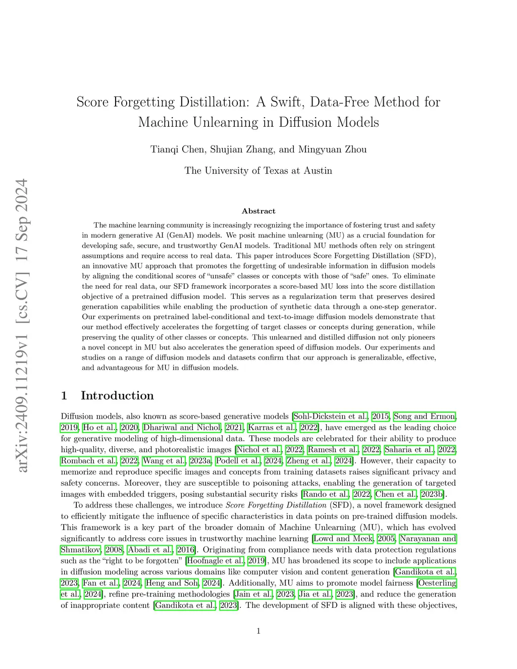 The machine learning community is increasingly recognizing the importance of fostering trust and safety in modern generative AI (GenAI) models. We posit machine unlearning (MU) as a crucial foundation for developing safe, secure, and trustworthy GenAI models. Traditional MU methods often rely on stringent assumptions and require access to real data. This paper introduces Score Forgetting Distillation (SFD), an innovative MU approach that promotes the forgetting of undesirable information in diffusion models by aligning the conditional scores of "unsafe" classes or concepts with those of "safe" ones. To eliminate the need for real data, our SFD framework incorporates a score-based MU loss into the score distillation objective of a pretrained diffusion model. This serves as a regularization term that preserves desired generation capabilities while enabling the production of synthetic data through a one-step generator. Our experiments on pretrained label-conditional and text-to-image diffusion models demonstrate that our method effectively accelerates the forgetting of target classes or concepts during generation, while preserving the quality of other classes or concepts. This unlearned and distilled diffusion not only pioneers a novel concept in MU but also accelerates the generation speed of diffusion models. Our experiments and studies on a range of diffusion models and datasets confirm that our approach is generalizable, effective, and advantageous for MU in diffusion models. Code is available atthis https URL. ( This paper contains sexually explicit imagery, discussions of pornography, racially-charged terminology, and other content that some readers may find disturbing, distressing, and/or offensive.)