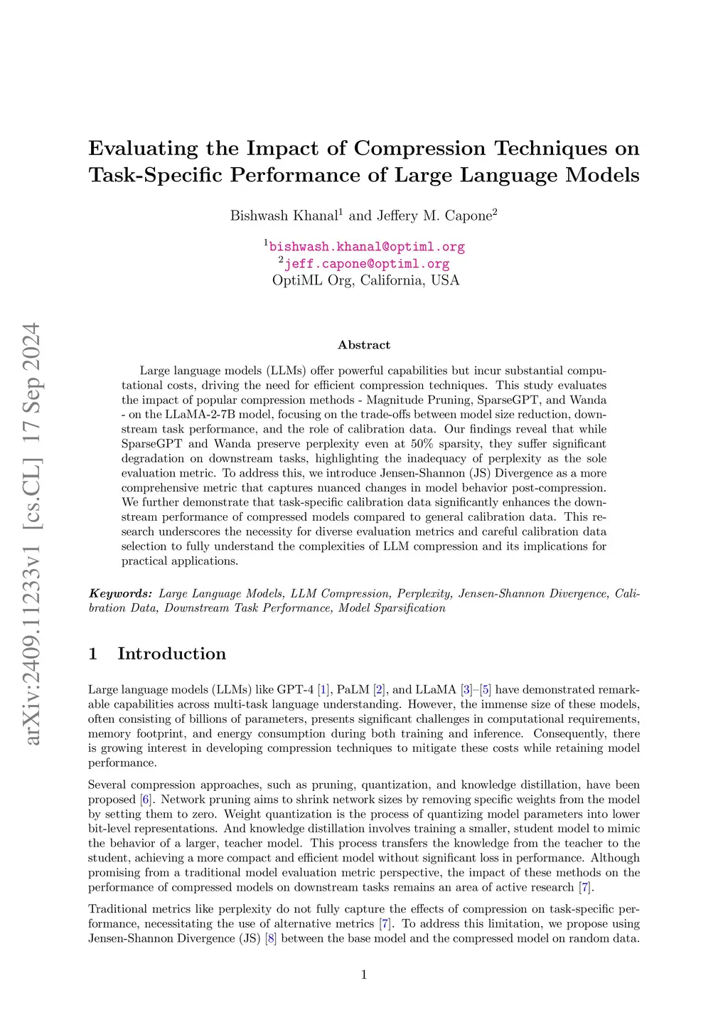 Large language models (LLMs) offer powerful capabilities but incur substantial computational costs, driving the need for efficient compression techniques. This study evaluates the impact of popular compression methods - Magnitude Pruning, SparseGPT, and Wanda - on the LLaMA-2-7B model, focusing on the trade-offs between model size reduction, downstream task performance, and the role of calibration data. Our findings reveal that while SparseGPT and Wanda preserve perplexity even at 50% sparsity, they suffer significant degradation on downstream tasks, highlighting the inadequacy of perplexity as the sole evaluation metric. To address this, we introduce Jensen-Shannon (JS) Divergence as a more comprehensive metric that captures nuanced changes in model behavior post-compression. We further demonstrate that task-specific calibration data significantly enhances the downstream performance of compressed models compared to general calibration data. This research underscores the necessity for diverse evaluation metrics and careful calibration data selection to fully understand the complexities of LLM compression and its implications for practical applications.