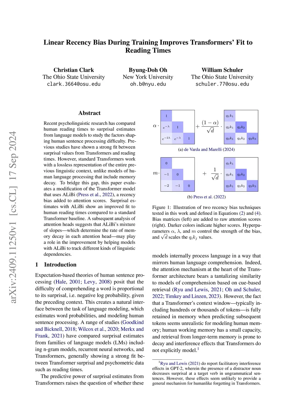 Recent psycholinguistic research has compared human reading times to surprisal estimates from language models to study the factors shaping human sentence processing difficulty. Previous studies have shown a strong fit between surprisal values from Transformers and reading times. However, standard Transformers work with a lossless representation of the entire previous linguistic context, unlike models of human language processing that include memory decay. To bridge this gap, this paper evaluates a modification of the Transformer model that uses ALiBi (Press et al., 2022), a recency bias added to attention scores. Surprisal estimates with ALiBi show an improved fit to human reading times compared to a standard Transformer baseline. A subsequent analysis of attention heads suggests that ALiBi's mixture of slopes -- which determine the rate of memory decay in each attention head -- may play a role in the improvement by helping models with ALiBi to track different kinds of linguistic dependencies.