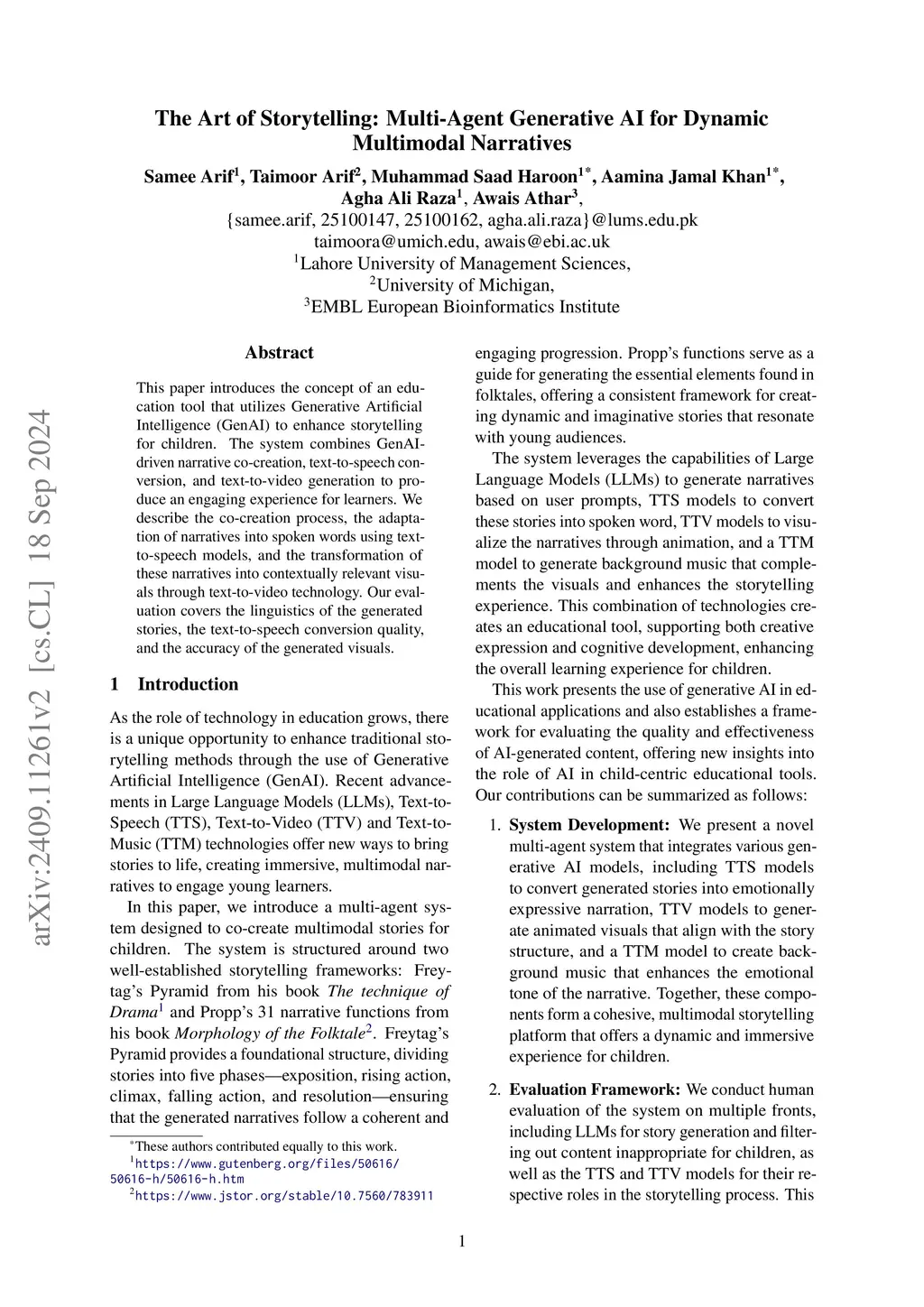 This paper introduces the concept of an education tool that utilizes Generative Artificial Intelligence (GenAI) to enhance storytelling. We evaluate GenAI-driven narrative co-creation, text-to-speech conversion, text-to-music and text-to-video generation to produce an engaging experience for learners. We describe the co-creation process, the adaptation of narratives into spoken words using text-to-speech models, and the transformation of these narratives into contextually relevant visuals through text-to-video technology. Our evaluation covers the linguistics of the generated stories, the text-to-speech conversion quality, and the accuracy of the generated visuals.
