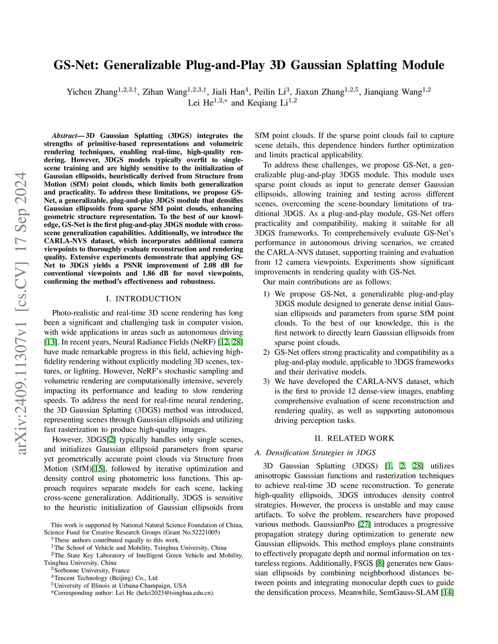 3D Gaussian Splatting (3DGS) integrates the strengths of primitive-based representations and volumetric rendering techniques, enabling real-time, high-quality rendering. However, 3DGS models typically overfit to single-scene training and are highly sensitive to the initialization of Gaussian ellipsoids, heuristically derived from Structure from Motion (SfM) point clouds, which limits both generalization and practicality. To address these limitations, we propose GS-Net, a generalizable, plug-and-play 3DGS module that densifies Gaussian ellipsoids from sparse SfM point clouds, enhancing geometric structure representation. To the best of our knowledge, GS-Net is the first plug-and-play 3DGS module with cross-scene generalization capabilities. Additionally, we introduce the CARLA-NVS dataset, which incorporates additional camera viewpoints to thoroughly evaluate reconstruction and rendering quality. Extensive experiments demonstrate that applying GS-Net to 3DGS yields a PSNR improvement of 2.08 dB for conventional viewpoints and 1.86 dB for novel viewpoints, confirming the method's effectiveness and robustness.