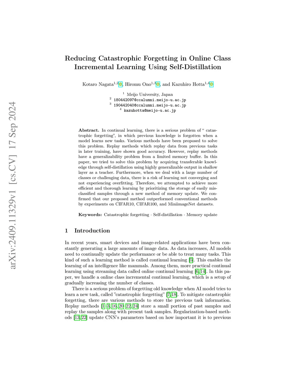 In continual learning, there is a serious problem of catastrophic forgetting, in which previous knowledge is forgotten when a model learns new tasks. Various methods have been proposed to solve this problem. Replay methods which replay data from previous tasks in later training, have shown good accuracy. However, replay methods have a generalizability problem from a limited memory buffer. In this paper, we tried to solve this problem by acquiring transferable knowledge through self-distillation using highly generalizable output in shallow layer as a teacher. Furthermore, when we deal with a large number of classes or challenging data, there is a risk of learning not converging and not experiencing overfitting. Therefore, we attempted to achieve more efficient and thorough learning by prioritizing the storage of easily misclassified samples through a new method of memory update. We confirmed that our proposed method outperformed conventional methods by experiments on CIFAR10, CIFAR100, and MiniimageNet datasets.
