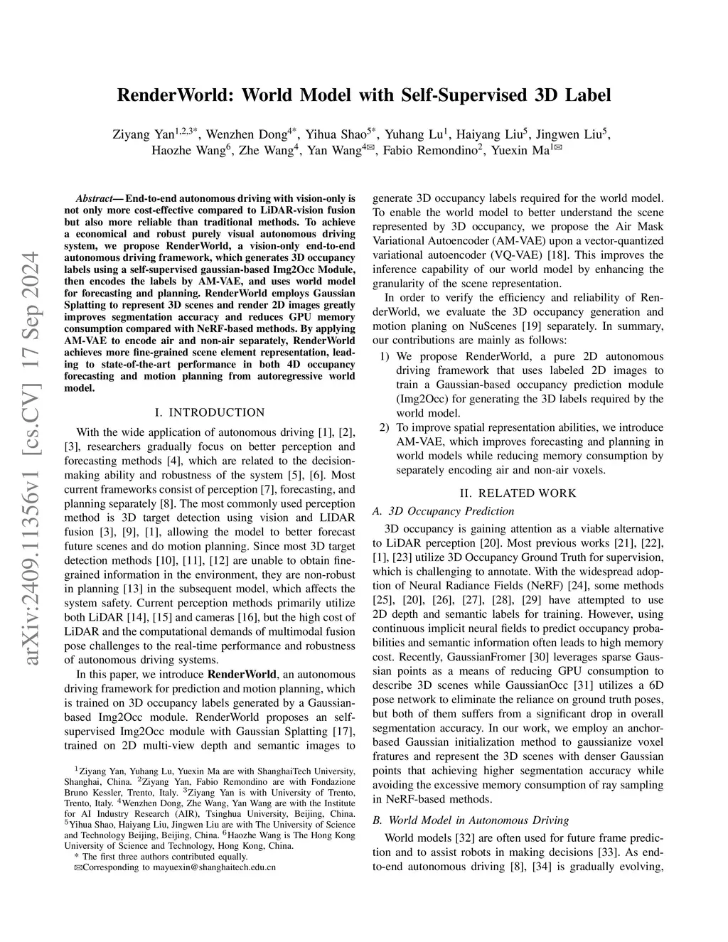End-to-end autonomous driving with vision-only is not only more cost-effective compared to LiDAR-vision fusion but also more reliable than traditional methods. To achieve a economical and robust purely visual autonomous driving system, we propose RenderWorld, a vision-only end-to-end autonomous driving framework, which generates 3D occupancy labels using a self-supervised gaussian-based Img2Occ Module, then encodes the labels by AM-VAE, and uses world model for forecasting and planning. RenderWorld employs Gaussian Splatting to represent 3D scenes and render 2D images greatly improves segmentation accuracy and reduces GPU memory consumption compared with NeRF-based methods. By applying AM-VAE to encode air and non-air separately, RenderWorld achieves more fine-grained scene element representation, leading to state-of-the-art performance in both 4D occupancy forecasting and motion planning from autoregressive world model.