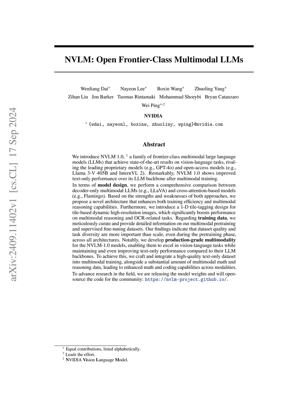 We introduce NVLM 1.0, a family of frontier-class multimodal large language models (LLMs) that achieve state-of-the-art results on vision-language tasks, rivaling the leading proprietary models (e.g., GPT-4o) and open-access models (e.g., Llama 3-V 405B and InternVL 2). Remarkably, NVLM 1.0 shows improved text-only performance over its LLM backbone after multimodal training. In terms of model design, we perform a comprehensive comparison between decoder-only multimodal LLMs (e.g., LLaVA) and cross-attention-based models (e.g., Flamingo). Based on the strengths and weaknesses of both approaches, we propose a novel architecture that enhances both training efficiency and multimodal reasoning capabilities. Furthermore, we introduce a 1-D tile-tagging design for tile-based dynamic high-resolution images, which significantly boosts performance on multimodal reasoning and OCR-related tasks. Regarding training data, we meticulously curate and provide detailed information on our multimodal pretraining and supervised fine-tuning datasets. Our findings indicate that dataset quality and task diversity are more important than scale, even during the pretraining phase, across all architectures. Notably, we develop production-grade multimodality for the NVLM-1.0 models, enabling them to excel in vision-language tasks while maintaining and even improving text-only performance compared to their LLM backbones. To achieve this, we craft and integrate a high-quality text-only dataset into multimodal training, alongside a substantial amount of multimodal math and reasoning data, leading to enhanced math and coding capabilities across modalities. To advance research in the field, we release the model weights at https://huggingface.co/nvidia/NVLM-D-72B and will open-source the training code for the community soon.