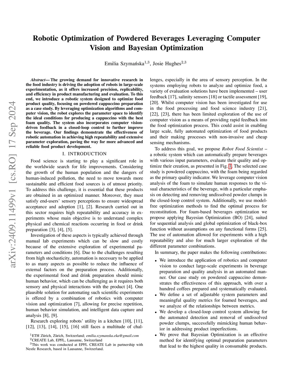 The growing demand for innovative research in the food industry is driving the adoption of robots in large-scale experimentation, as it offers increased precision, replicability, and efficiency in product manufacturing and evaluation. To this end, we introduce a robotic system designed to optimize food product quality, focusing on powdered cappuccino preparation as a case study. By leveraging optimization algorithms and computer vision, the robot explores the parameter space to identify the ideal conditions for producing a cappuccino with the best foam quality. The system also incorporates computer vision-driven feedback in a closed-loop control to further improve the beverage. Our findings demonstrate the effectiveness of robotic automation in achieving high repeatability and extensive parameter exploration, paving the way for more advanced and reliable food product development.