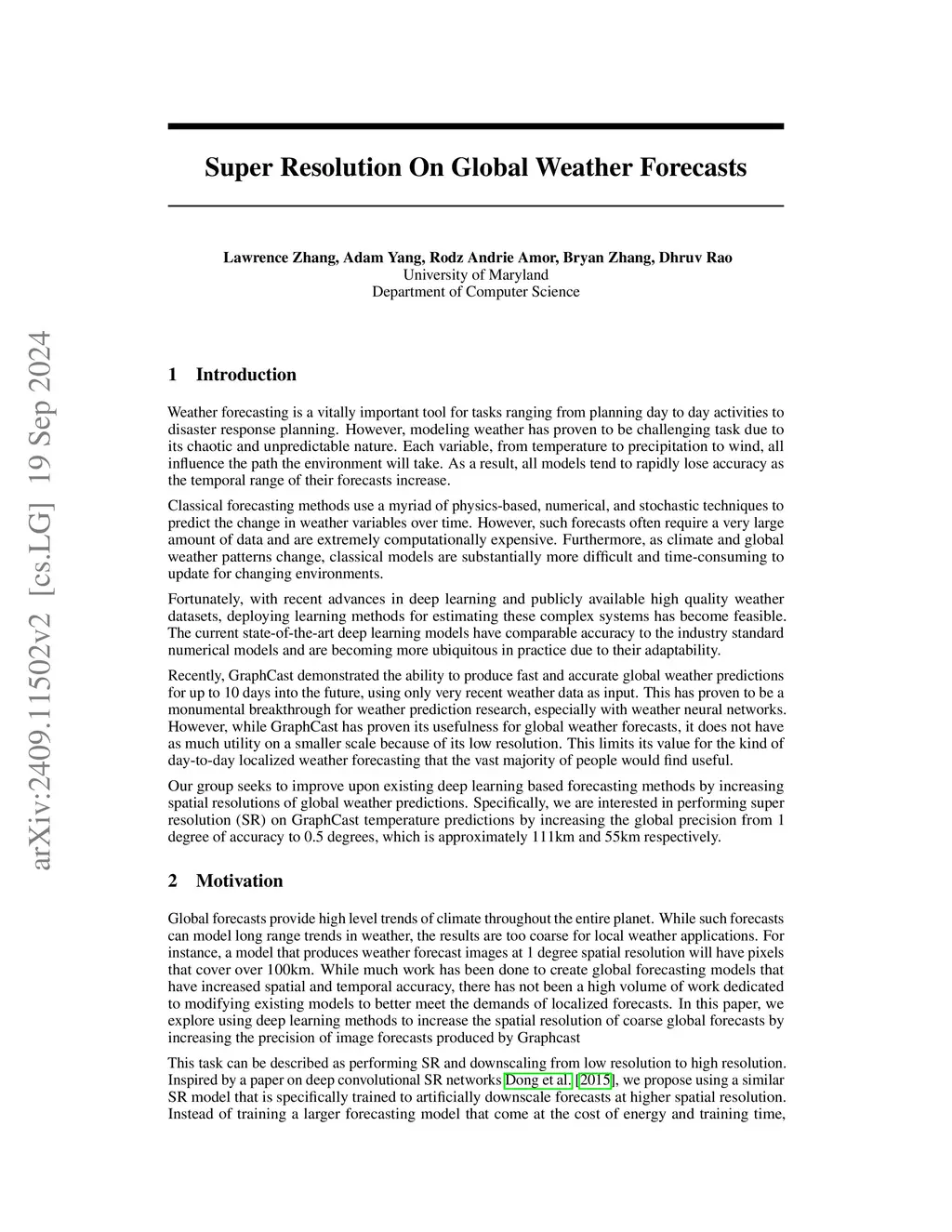Weather forecasting is a vitally important tool for tasks ranging from planning day to day activities to disaster response planning. However, modeling weather has proven to be challenging task due to its chaotic and unpredictable nature. Each variable, from temperature to precipitation to wind, all influence the path the environment will take. As a result, all models tend to rapidly lose accuracy as the temporal range of their forecasts increase. Classical forecasting methods use a myriad of physics-based, numerical, and stochastic techniques to predict the change in weather variables over time. However, such forecasts often require a very large amount of data and are extremely computationally expensive. Furthermore, as climate and global weather patterns change, classical models are substantially more difficult and time-consuming to update for changing environments. Fortunately, with recent advances in deep learning and publicly available high quality weather datasets, deploying learning methods for estimating these complex systems has become feasible. The current state-of-the-art deep learning models have comparable accuracy to the industry standard numerical models and are becoming more ubiquitous in practice due to their adaptability. Our group seeks to improve upon existing deep learning based forecasting methods by increasing spatial resolutions of global weather predictions. Specifically, we are interested in performing super resolution (SR) on GraphCast temperature predictions by increasing the global precision from 1 degree of accuracy to 0.5 degrees, which is approximately 111km and 55km respectively.
