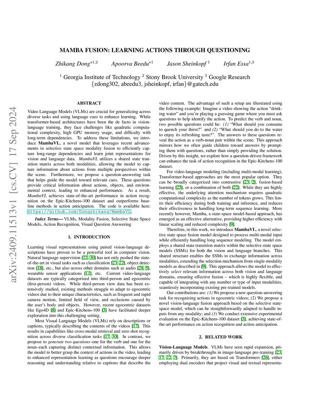 Video Language Models (VLMs) are crucial for generalizing across diverse tasks and using language cues to enhance learning. While transformer-based architectures have been the de facto in vision-language training, they face challenges like quadratic computational complexity, high GPU memory usage, and difficulty with long-term dependencies. To address these limitations, we introduce MambaVL, a novel model that leverages recent advancements in selective state space modality fusion to efficiently capture long-range dependencies and learn joint representations for vision and language data. MambaVL utilizes a shared state transition matrix across both modalities, allowing the model to capture information about actions from multiple perspectives within the scene. Furthermore, we propose a question-answering task that helps guide the model toward relevant cues. These questions provide critical information about actions, objects, and environmental context, leading to enhanced performance. As a result, MambaVL achieves state-of-the-art performance in action recognition on the Epic-Kitchens-100 dataset and outperforms baseline methods in action anticipation.
