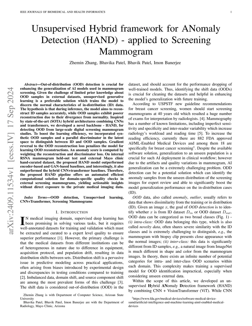 Out-of-distribution (OOD) detection is crucial for enhancing the generalization of AI models used in mammogram screening. Given the challenge of limited prior knowledge about OOD samples in external datasets, unsupervised generative learning is a preferable solution which trains the model to discern the normal characteristics of in-distribution (ID) data. The hypothesis is that during inference, the model aims to reconstruct ID samples accurately, while OOD samples exhibit poorer reconstruction due to their divergence from normality. Inspired by state-of-the-art (SOTA) hybrid architectures combining CNNs and transformers, we developed a novel backbone - HAND, for detecting OOD from large-scale digital screening mammogram studies. To boost the learning efficiency, we incorporated synthetic OOD samples and a parallel discriminator in the latent space to distinguish between ID and OOD samples. Gradient reversal to the OOD reconstruction loss penalizes the model for learning OOD reconstructions. An anomaly score is computed by weighting the reconstruction and discriminator loss. On internal RSNA mammogram held-out test and external Mayo clinic hand-curated dataset, the proposed HAND model outperformed encoder-based and GAN-based baselines, and interestingly, it also outperformed the hybrid CNN+transformer baselines. Therefore, the proposed HAND pipeline offers an automated efficient computational solution for domain-specific quality checks in external screening mammograms, yielding actionable insights without direct exposure to the private medical imaging data.