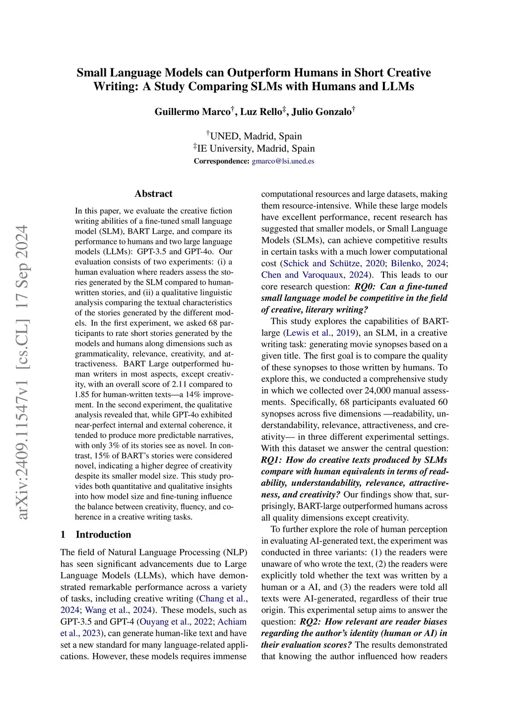 In this paper, we evaluate the creative fiction writing abilities of a fine-tuned small language model (SLM), BART-large, and compare its performance to human writers and two large language models (LLMs): GPT-3.5 and GPT-4o. Our evaluation consists of two experiments: (i) a human study in which 68 participants rated short stories from humans and the SLM on grammaticality, relevance, creativity, and attractiveness, and (ii) a qualitative linguistic analysis examining the textual characteristics of stories produced by each model. In the first experiment, BART-large outscored average human writers overall (2.11 vs. 1.85), a 14% relative improvement, though the slight human advantage in creativity was not statistically significant. In the second experiment, qualitative analysis showed that while GPT-4o demonstrated near-perfect coherence and used less cliche phrases, it tended to produce more predictable language, with only 3% of its synopses featuring surprising associations (compared to 15% for BART). These findings highlight how model size and fine-tuning influence the balance between creativity, fluency, and coherence in creative writing tasks, and demonstrate that smaller models can, in certain contexts, rival both humans and larger models.