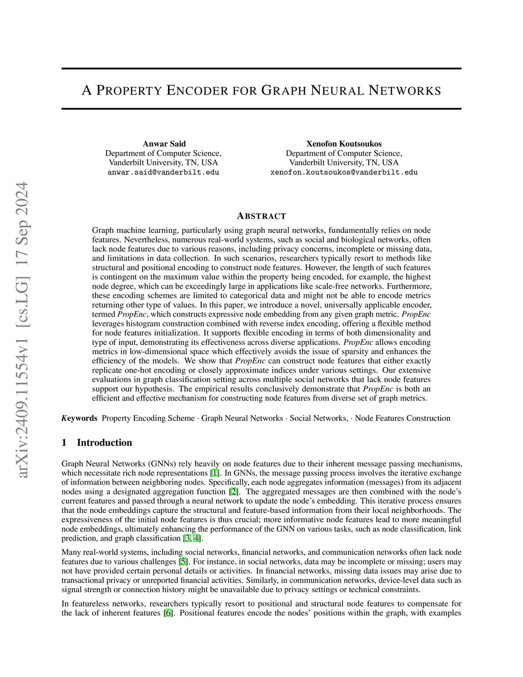 Graph machine learning, particularly using graph neural networks, heavily relies on node features. However, many real-world systems, such as social and biological networks, lack node features due to privacy concerns, incomplete data, or collection limitations. Structural and positional encoding are commonly used to address this but are constrained by the maximum values of the encoded properties, such as the highest node degree. This limitation makes them impractical for scale-free networks and applications involving large or non-categorical properties. This paper introduces PropEnc, a novel and versatile encoder to generate expressive node embedding from any graph metric. By combining histogram construction with reversed index encoding, PropEnc offers a flexible solution that supports low-dimensional representations and diverse input types, effectively mitigating sparsity issues while improving computational efficiency. Additionally, it replicates one-hot encoding or approximates indices with high accuracy, making it adaptable to a wide range of graph applications. We validate PropEnc through extensive experiments on graph classification task across several social networks lacking node features. The empirical results demonstrate that PropEnc offers an efficient mechanism for constructing node features from various graph metrics.
