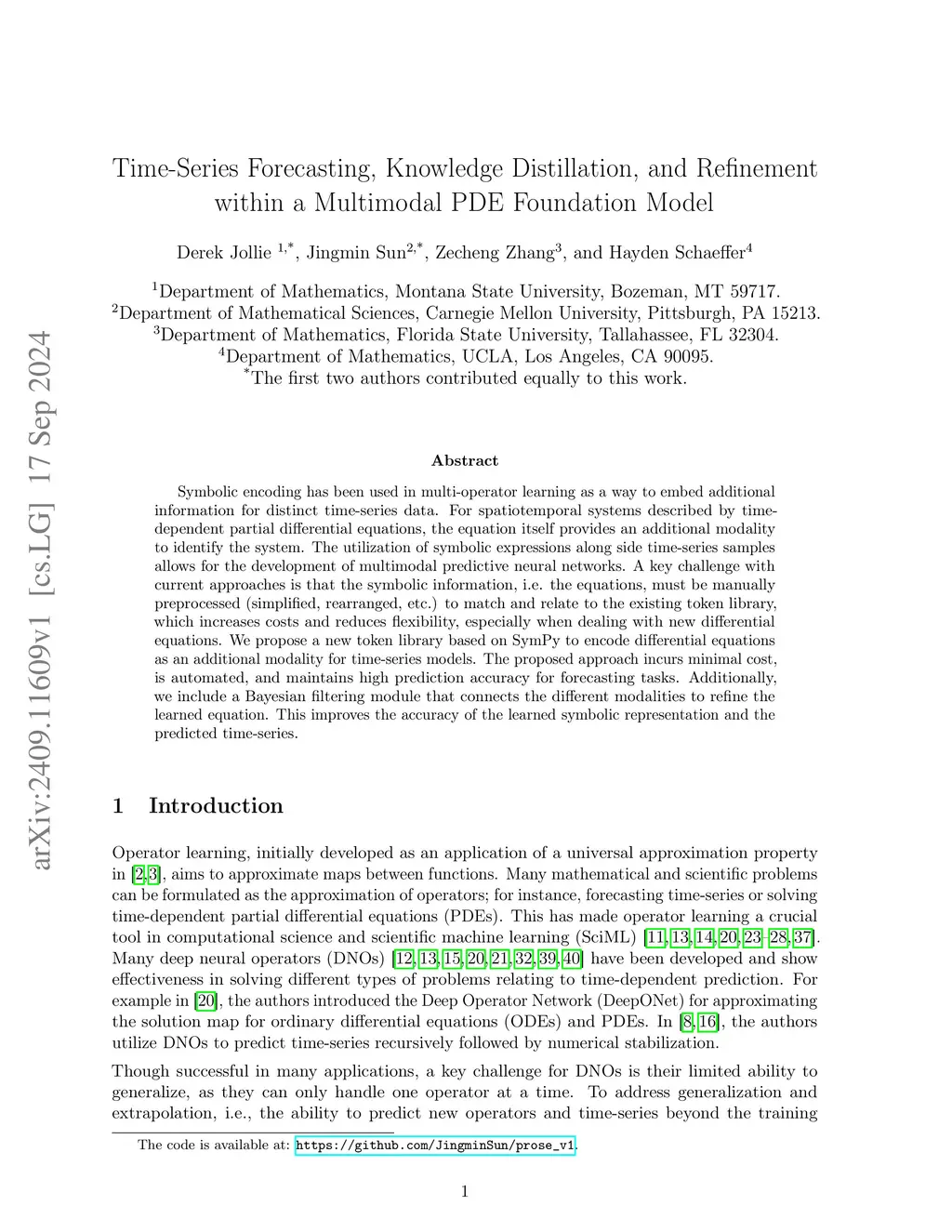 Symbolic encoding has been used in multi-operator learning as a way to embed additional information for distinct time-series data. For spatiotemporal systems described by time-dependent partial differential equations, the equation itself provides an additional modality to identify the system. The utilization of symbolic expressions along side time-series samples allows for the development of multimodal predictive neural networks. A key challenge with current approaches is that the symbolic information, i.e. the equations, must be manually preprocessed (simplified, rearranged, etc.) to match and relate to the existing token library, which increases costs and reduces flexibility, especially when dealing with new differential equations. We propose a new token library based on SymPy to encode differential equations as an additional modality for time-series models. The proposed approach incurs minimal cost, is automated, and maintains high prediction accuracy for forecasting tasks. Additionally, we include a Bayesian filtering module that connects the different modalities to refine the learned equation. This improves the accuracy of the learned symbolic representation and the predicted time-series.