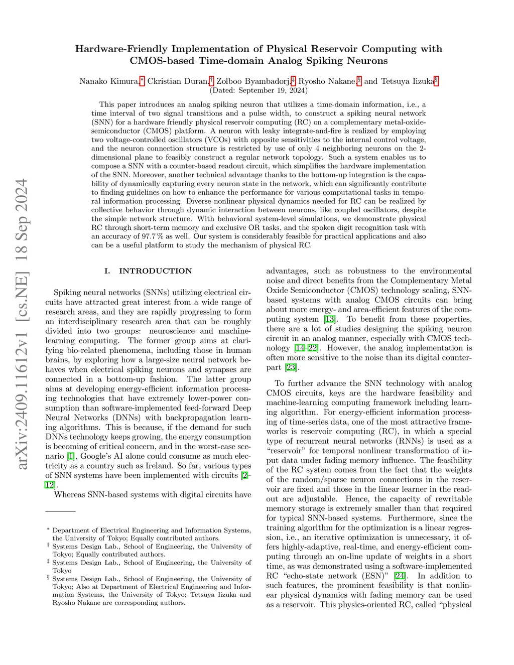 This paper introduces an analog spiking neuron that utilizes time-domain information, i.e., a time interval of two signal transitions and a pulse width, to construct a spiking neural network (SNN) for a hardware-friendly physical reservoir computing (RC) on a complementary metal-oxide-semiconductor (CMOS) platform. A neuron with leaky integrate-and-fire is realized by employing two voltage-controlled oscillators (VCOs) with opposite sensitivities to the internal control voltage, and the neuron connection structure is restricted by the use of only 4 neighboring neurons on the 2-dimensional plane to feasibly construct a regular network topology. Such a system enables us to compose an SNN with a counter-based readout circuit, which simplifies the hardware implementation of the SNN. Moreover, another technical advantage thanks to the bottom-up integration is the capability of dynamically capturing every neuron state in the network, which can significantly contribute to finding guidelines on how to enhance the performance for various computational tasks in temporal information processing. Diverse nonlinear physical dynamics needed for RC can be realized by collective behavior through dynamic interaction between neurons, like coupled oscillators, despite the simple network structure. With behavioral system-level simulations, we demonstrate physical RC through short-term memory and exclusive OR tasks, and the spoken digit recognition task with an accuracy of 97.7% as well. Our system is considerably feasible for practical applications and also can be a useful platform for studying the mechanism of physical RC.