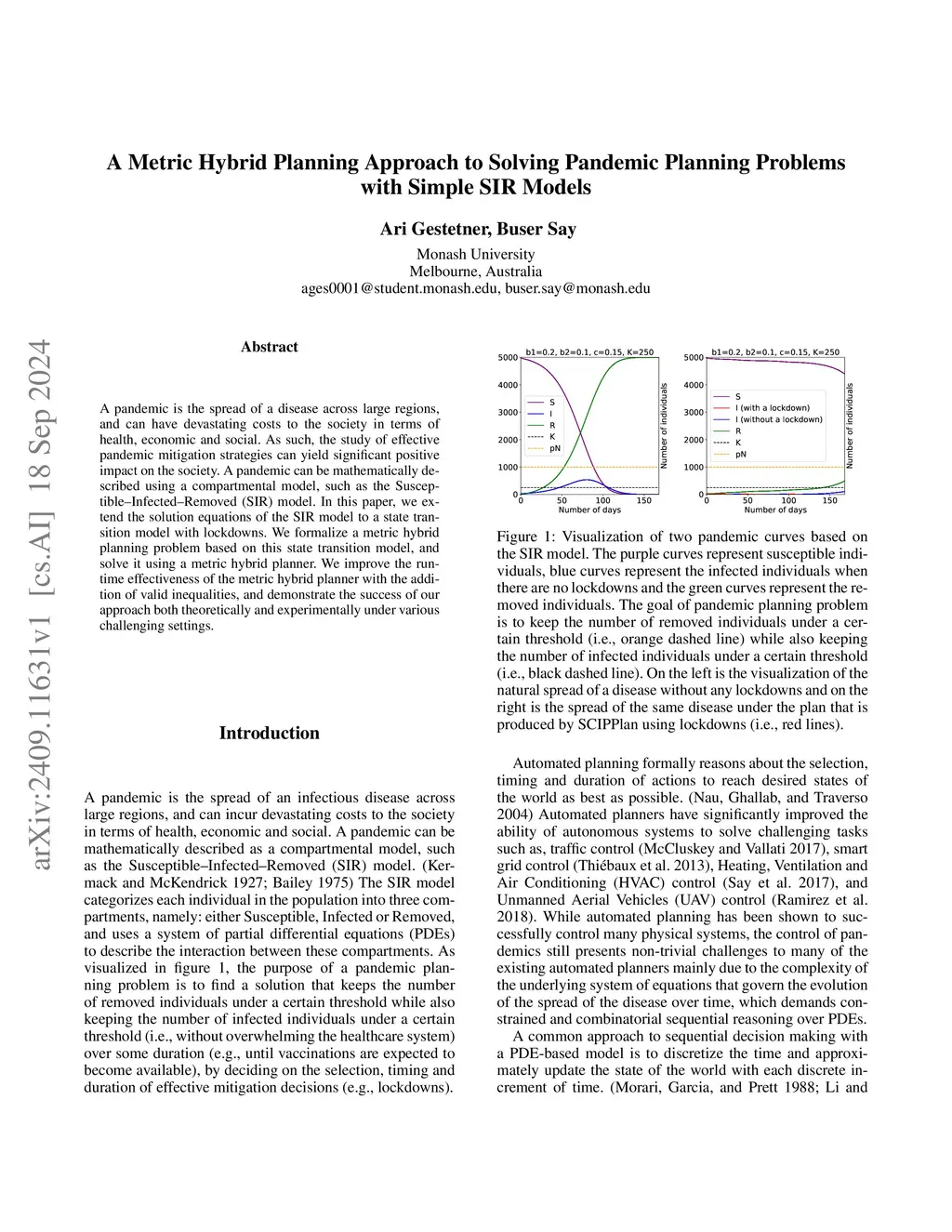 A pandemic is the spread of a disease across large regions, and can have devastating costs to the society in terms of health, economic and social. As such, the study of effective pandemic mitigation strategies can yield significant positive impact on the society. A pandemic can be mathematically described using a compartmental model, such as the Susceptible Infected Removed (SIR) model. In this paper, we extend the solution equations of the SIR model to a state transition model with lockdowns. We formalize a metric hybrid planning problem based on this state transition model, and solve it using a metric hybrid planner. We improve the runtime effectiveness of the metric hybrid planner with the addition of valid inequalities, and demonstrate the success of our approach both theoretically and experimentally under various challenging settings.