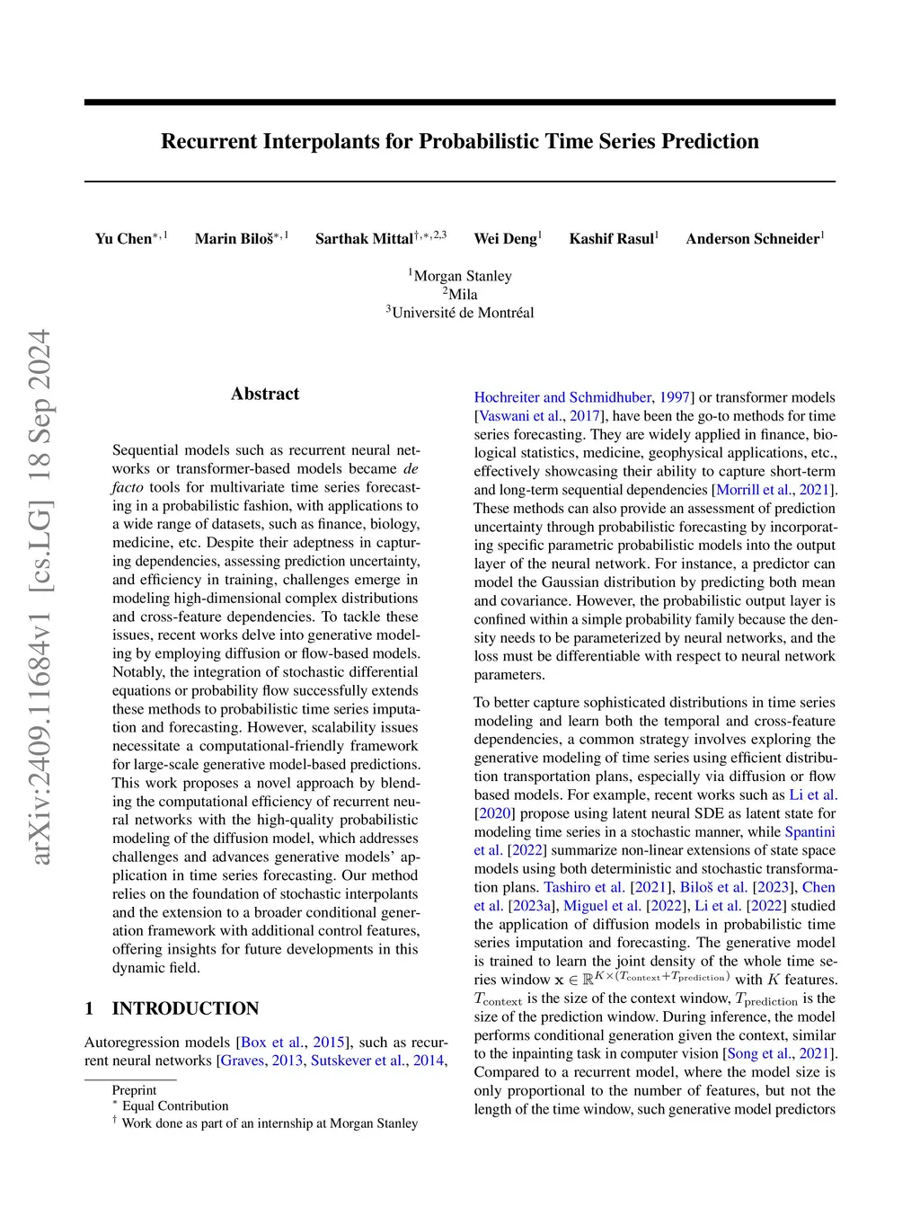 Sequential models like recurrent neural networks and transformers have become standard for probabilistic multivariate time series forecasting across various domains. Despite their strengths, they struggle with capturing high-dimensional distributions and cross-feature dependencies. Recent work explores generative approaches using diffusion or flow-based models, extending to time series imputation and forecasting. However, scalability remains a challenge. This work proposes a novel method combining recurrent neural networks' efficiency with diffusion models' probabilistic modeling, based on stochastic interpolants and conditional generation with control features, offering insights for future developments in this dynamic field.
