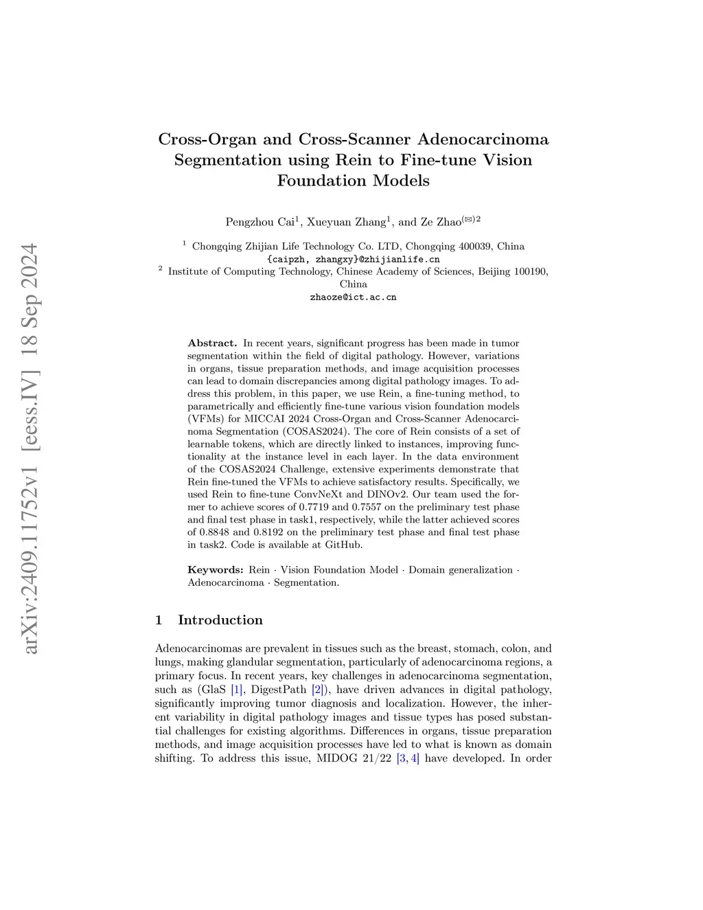 In recent years, significant progress has been made in tumor segmentation within the field of digital pathology. However, variations in organs, tissue preparation methods, and image acquisition processes can lead to domain discrepancies among digital pathology images. To address this problem, in this paper, we use Rein, a fine-tuning method, to parametrically and efficiently fine-tune various vision foundation models (VFMs) for MICCAI 2024 Cross-Organ and Cross-Scanner Adenocarcinoma Segmentation (COSAS2024). The core of Rein consists of a set of learnable tokens, which are directly linked to instances, improving functionality at the instance level in each layer. In the data environment of the COSAS2024 Challenge, extensive experiments demonstrate that Rein fine-tuned the VFMs to achieve satisfactory results. Specifically, we used Rein to fine-tune ConvNeXt and DINOv2. Our team used the former to achieve scores of 0.7719 and 0.7557 on the preliminary test phase and final test phase in task1, respectively, while the latter achieved scores of 0.8848 and 0.8192 on the preliminary test phase and final test phase in task2. Code is available at GitHub.