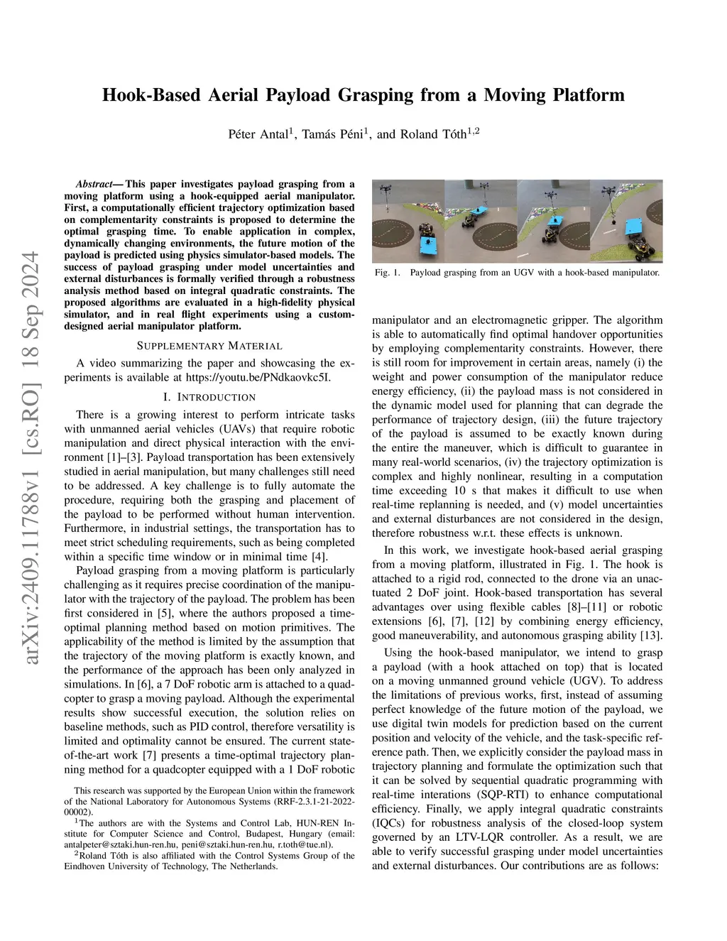 Hook-Based Aerial Payload Grasping from a Moving Platform
