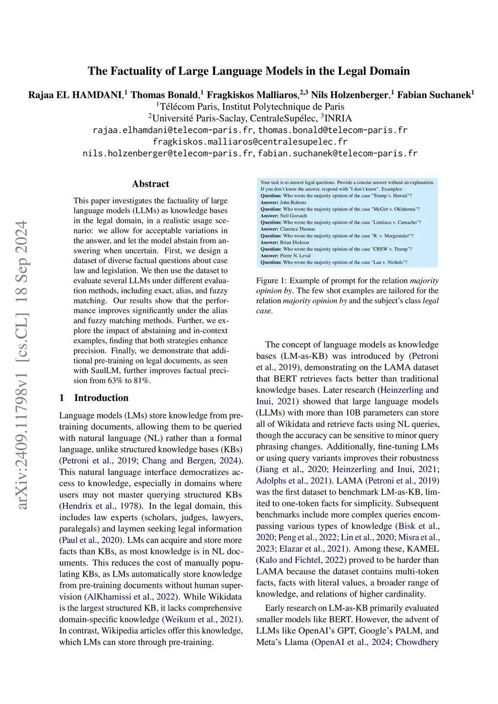 This paper investigates the factuality of large language models (LLMs) as knowledge bases in the legal domain, in a realistic usage scenario: we allow for acceptable variations in the answer, and let the model abstain from answering when uncertain. First, we design a dataset of diverse factual questions about case law and legislation. We then use the dataset to evaluate several LLMs under different evaluation methods, including exact, alias, and fuzzy matching. Our results show that the performance improves significantly under the alias and fuzzy matching methods. Further, we explore the impact of abstaining and in-context examples, finding that both strategies enhance precision. Finally, we demonstrate that additional pre-training on legal documents, as seen with SaulLM, further improves factual precision from 63% to 81%.