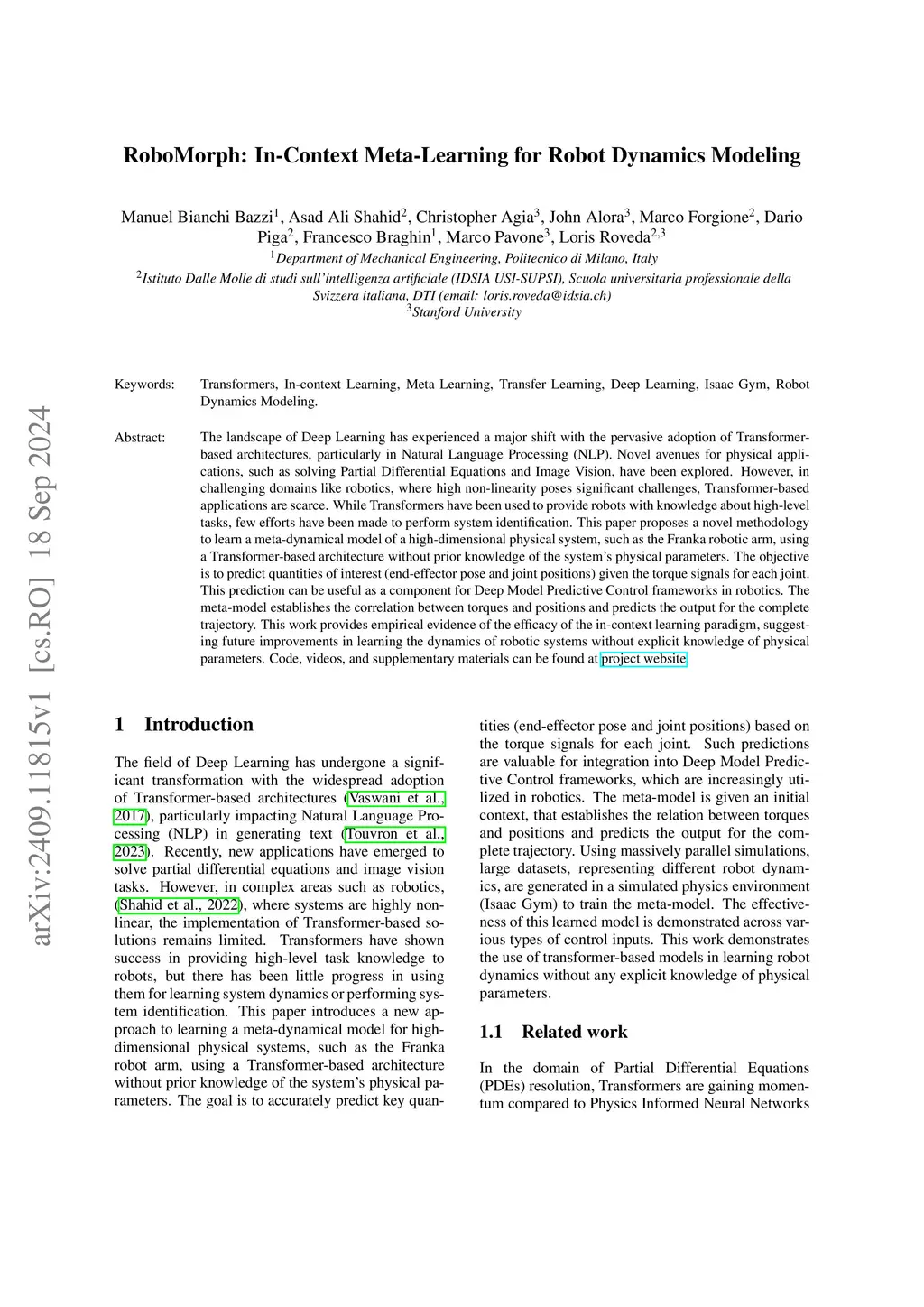 The landscape of Deep Learning has experienced a major shift with the pervasive adoption of Transformer-based architectures, particularly in Natural Language Processing (NLP). Novel avenues for physical applications, such as solving Partial Differential Equations and Image Vision, have been explored. However, in challenging domains like robotics, where high non-linearity poses significant challenges, Transformer-based applications are scarce. While Transformers have been used to provide robots with knowledge about high-level tasks, few efforts have been made to perform system identification. This paper proposes a novel methodology to learn a meta-dynamical model of a high-dimensional physical system, such as the Franka robotic arm, using a Transformer-based architecture without prior knowledge of the system's physical parameters. The objective is to predict quantities of interest (end-effector pose and joint positions) given the torque signals for each joint. This prediction can be useful as a component for Deep Model Predictive Control frameworks in robotics. The meta-model establishes the correlation between torques and positions and predicts the output for the complete trajectory. This work provides empirical evidence of the efficacy of the in-context learning paradigm, suggesting future improvements in learning the dynamics of robotic systems without explicit knowledge of physical parameters. Code, videos, and supplementary materials can be found at project website. See https://sites.google.com/view/robomorph/