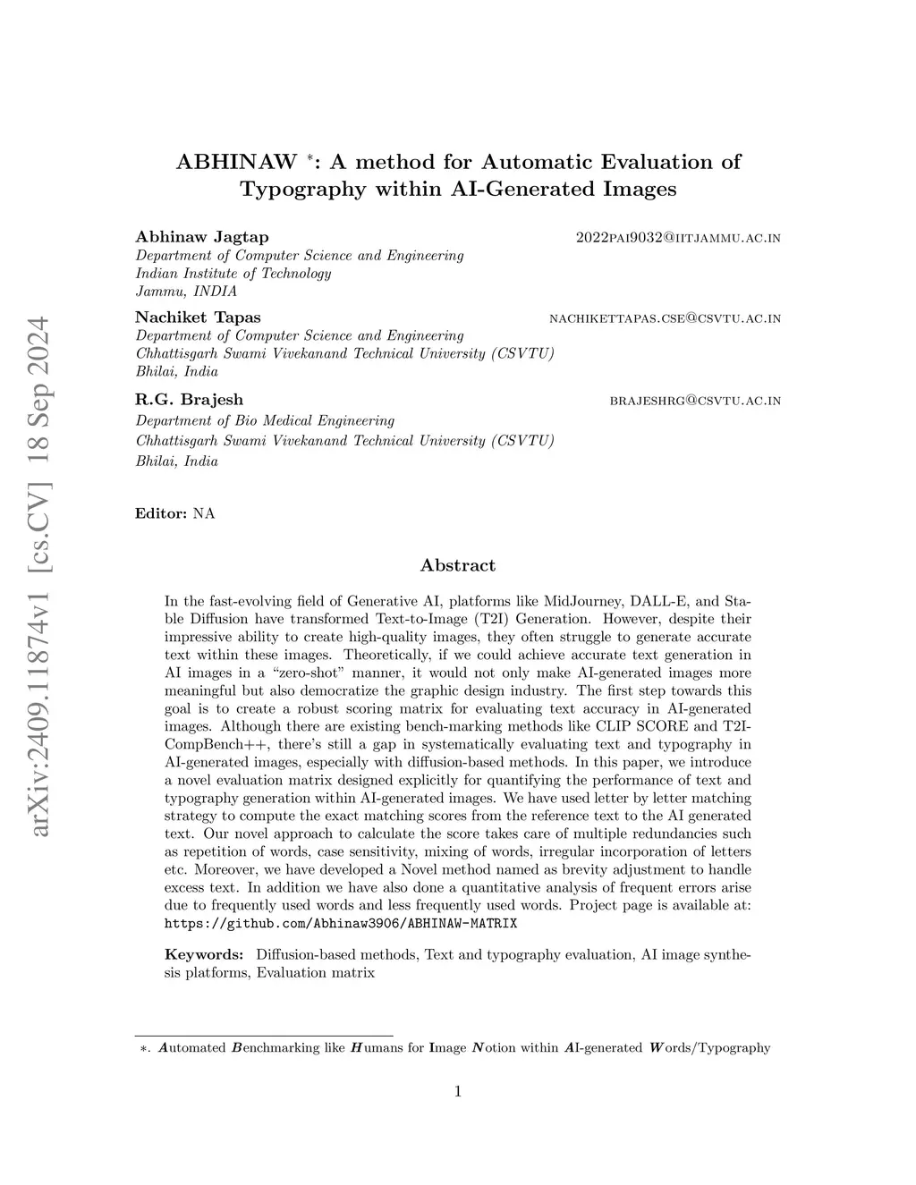 In the fast-evolving field of Generative AI, platforms like MidJourney, DALL-E, and Stable Diffusion have transformed Text-to-Image (T2I) Generation. However, despite their impressive ability to create high-quality images, they often struggle to generate accurate text within these images. Theoretically, if we could achieve accurate text generation in AI images in a ``zero-shot'' manner, it would not only make AI-generated images more meaningful but also democratize the graphic design industry. The first step towards this goal is to create a robust scoring matrix for evaluating text accuracy in AI-generated images. Although there are existing bench-marking methods like CLIP SCORE and T2I-CompBench++, there's still a gap in systematically evaluating text and typography in AI-generated images, especially with diffusion-based methods. In this paper, we introduce a novel evaluation matrix designed explicitly for quantifying the performance of text and typography generation within AI-generated images. We have used letter by letter matching strategy to compute the exact matching scores from the reference text to the AI generated text. Our novel approach to calculate the score takes care of multiple redundancies such as repetition of words, case sensitivity, mixing of words, irregular incorporation of letters etc. Moreover, we have developed a Novel method named as brevity adjustment to handle excess text. In addition we have also done a quantitative analysis of frequent errors arise due to frequently used words and less frequently used words. Project page is available at: https://github.com/Abhinaw3906/ABHINAW-MATRIX.