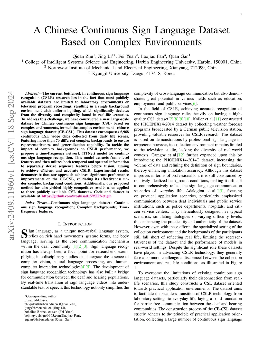 A Chinese Continuous Sign Language Dataset Based on Complex Environments