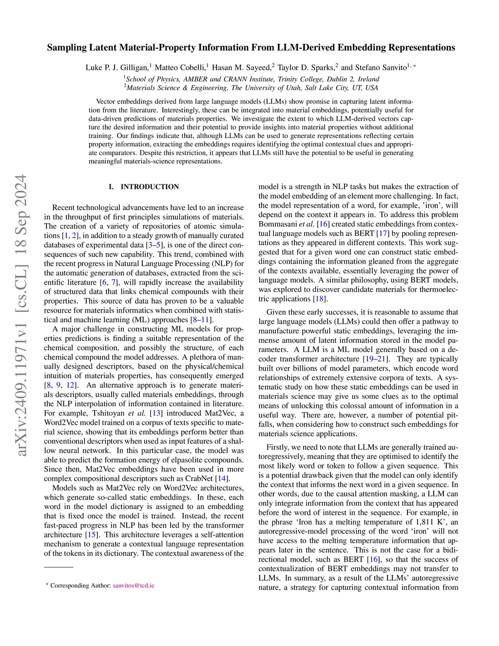 Sampling Latent Material-Property Information From LLM-Derived Embedding
