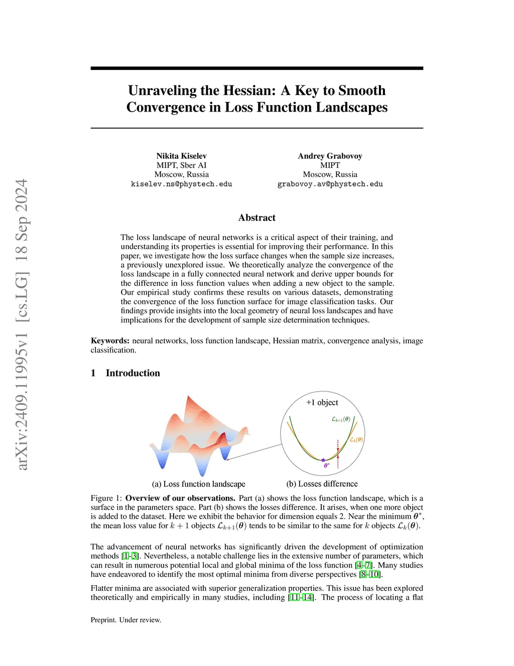 The loss landscape of neural networks is a critical aspect of their training, and understanding its properties is essential for improving their performance. In this paper, we investigate how the loss surface changes when the sample size increases, a previously unexplored issue. We theoretically analyze the convergence of the loss landscape in a fully connected neural network and derive upper bounds for the difference in loss function values when adding a new object to the sample. Our empirical study confirms these results on various datasets, demonstrating the convergence of the loss function surface for image classification tasks. Our findings provide insights into the local geometry of neural loss landscapes and have implications for the development of sample size determination techniques.