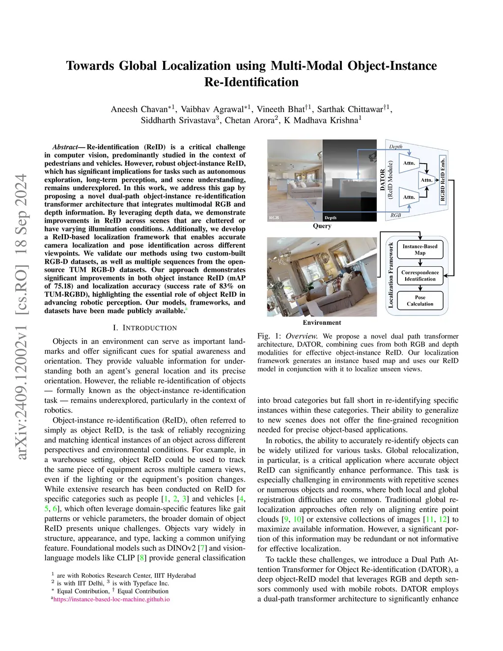 Re-identification (ReID) is a critical challenge in computer vision, predominantly studied in the context of pedestrians and vehicles. However, robust object-instance ReID, which has significant implications for tasks such as autonomous exploration, long-term perception, and scene understanding, remains underexplored. In this work, we address this gap by proposing a novel dual-path object-instance re-identification transformer architecture that integrates multimodal RGB and depth information. By leveraging depth data, we demonstrate improvements in ReID across scenes that are cluttered or have varying illumination conditions. Additionally, we develop a ReID-based localization framework that enables accurate camera localization and pose identification across different viewpoints. We validate our methods using two custom-built RGB-D datasets, as well as multiple sequences from the open-source TUM RGB-D datasets. Our approach demonstrates significant improvements in both object instance ReID (mAP of 75.18) and localization accuracy (success rate of 83% on TUM-RGBD), highlighting the essential role of object ReID in advancing robotic perception. Our models, frameworks, and datasets have been made publicly available.