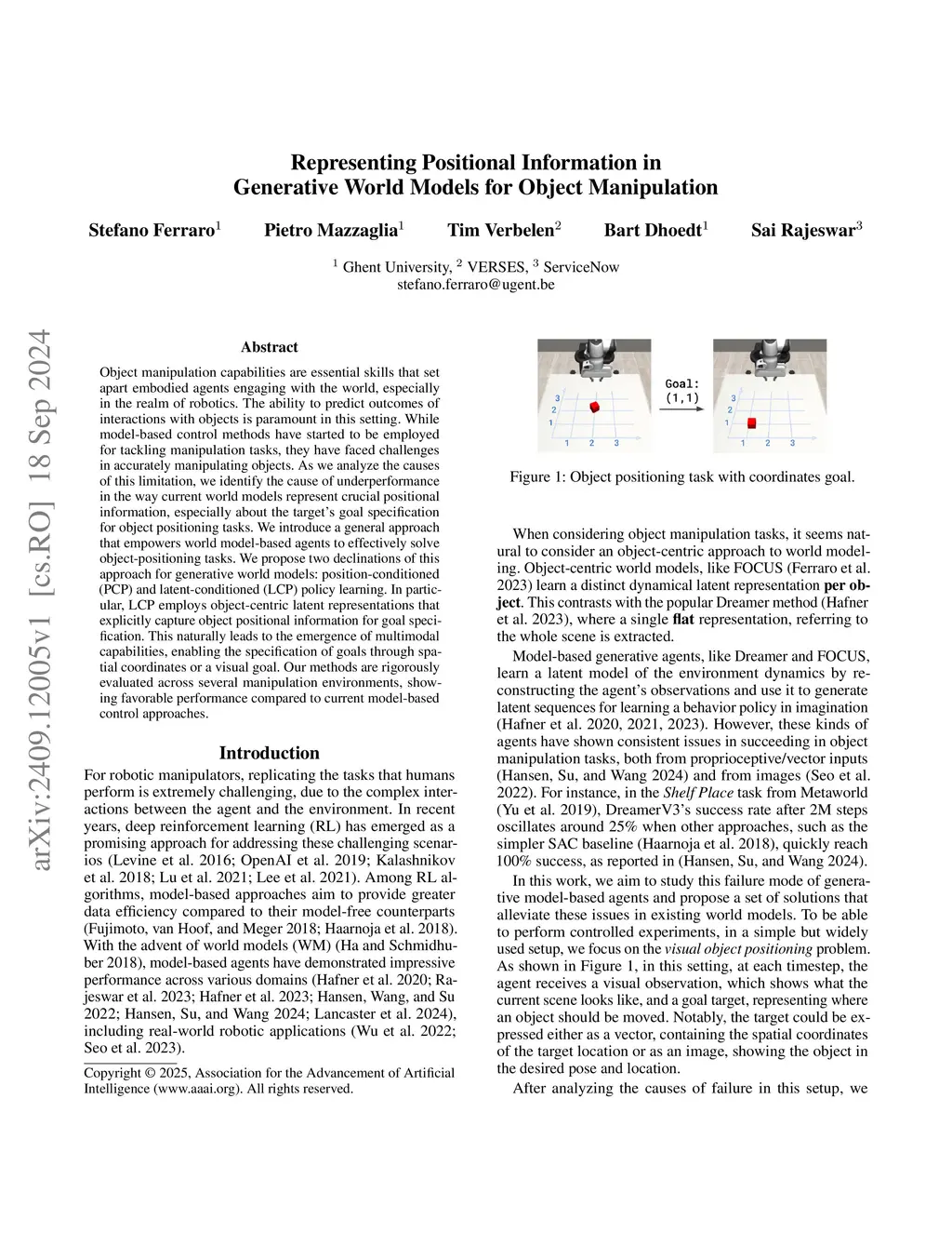 Object manipulation capabilities are essential skills that set apart embodied agents engaging with the world, especially in the realm of robotics. The ability to predict outcomes of interactions with objects is paramount in this setting. While model-based control methods have started to be employed for tackling manipulation tasks, they have faced challenges in accurately manipulating objects. As we analyze the causes of this limitation, we identify the cause of underperformance in the way current world models represent crucial positional information, especially about the target's goal specification for object positioning tasks. We introduce a general approach that empowers world model-based agents to effectively solve object-positioning tasks. We propose two declinations of this approach for generative world models: position-conditioned (PCP) and latent-conditioned (LCP) policy learning. In particular, LCP employs object-centric latent representations that explicitly capture object positional information for goal specification. This naturally leads to the emergence of multimodal capabilities, enabling the specification of goals through spatial coordinates or a visual goal. Our methods are rigorously evaluated across several manipulation environments, showing favorable performance compared to current model-based control approaches.