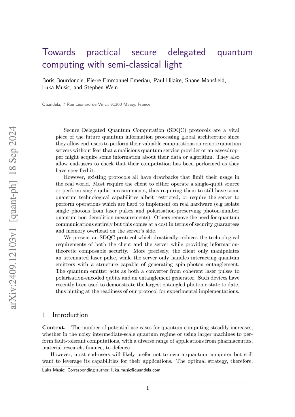 Secure Delegated Quantum Computation (SDQC) protocols are a vital piece of the future quantum information processing global architecture since they allow end-users to perform their valuable computations on remote quantum servers without fear that a malicious quantum service provider or an eavesdropper might acquire some information about their data or algorithm. They also allow end-users to check that their computation has been performed as they have specified it.However, existing protocols all have drawbacks that limit their usage in the real world. Most require the client to either operate a single-qubit source or perform single-qubit measurements, thus requiring them to still have some quantum technological capabilities albeit restricted, or require the server to perform operations which are hard to implement on real hardware (e.g isolate single photons from laser pulses and polarisation-preserving photon-number quantum non-demolition measurements). Others remove the need for quantum communications entirely but this comes at a cost in terms of security guarantees and memory overhead on the server's side.We present an SDQC protocol which drastically reduces the technological requirements of both the client and the server while providing information-theoretic composable security. More precisely, the client only manipulates an attenuated laser pulse, while the server only handles interacting quantum emitters with a structure capable of generating spin-photon entanglement. The quantum emitter acts as both a converter from coherent laser pulses to polarisation-encoded qubits and an entanglement generator. Such devices have recently been used to demonstrate the largest entangled photonic state to date, thus hinting at the readiness of our protocol for experimental implementations.